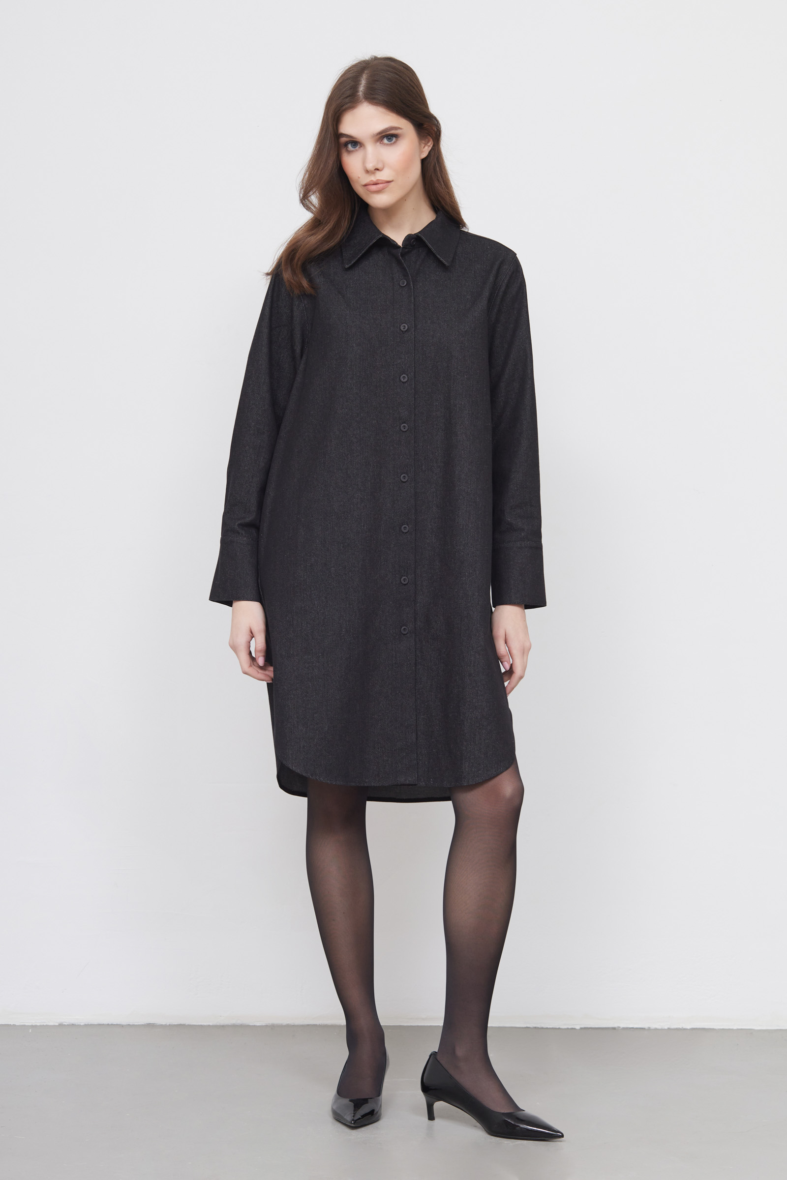 Короткое платье-рубашка из плотного денима.