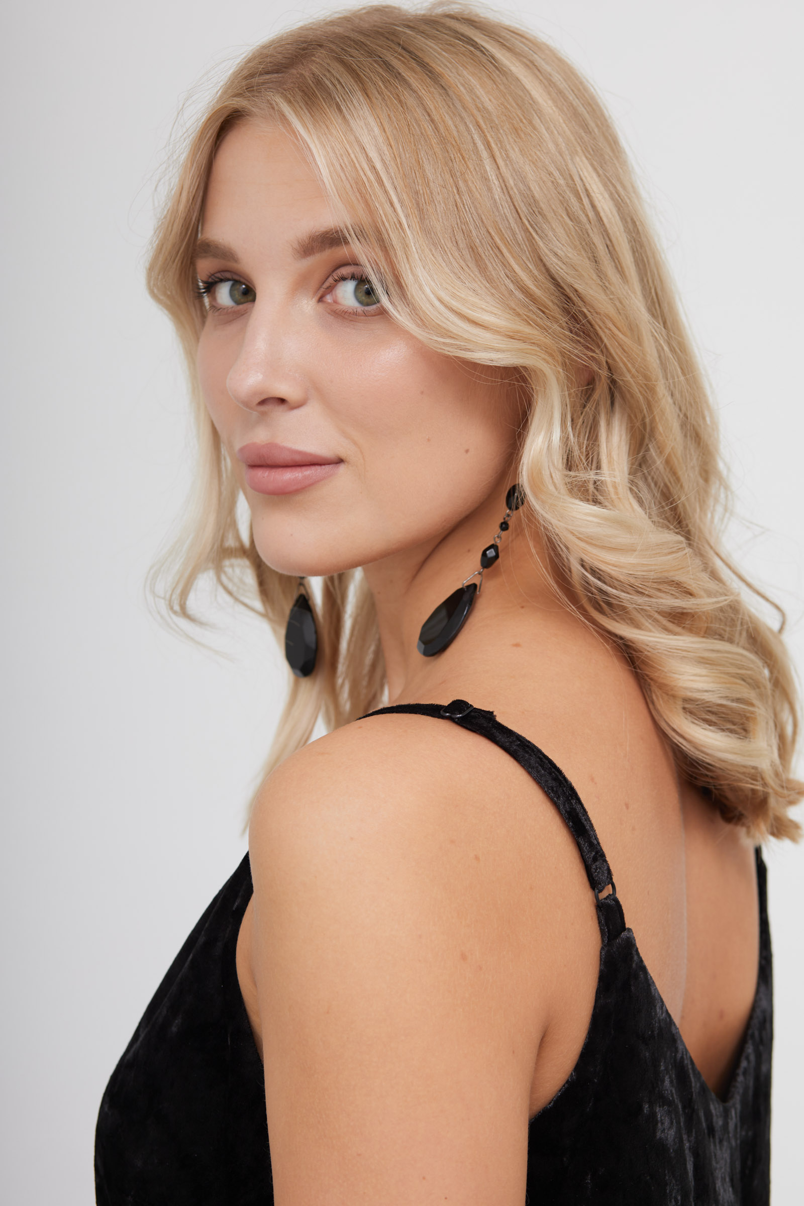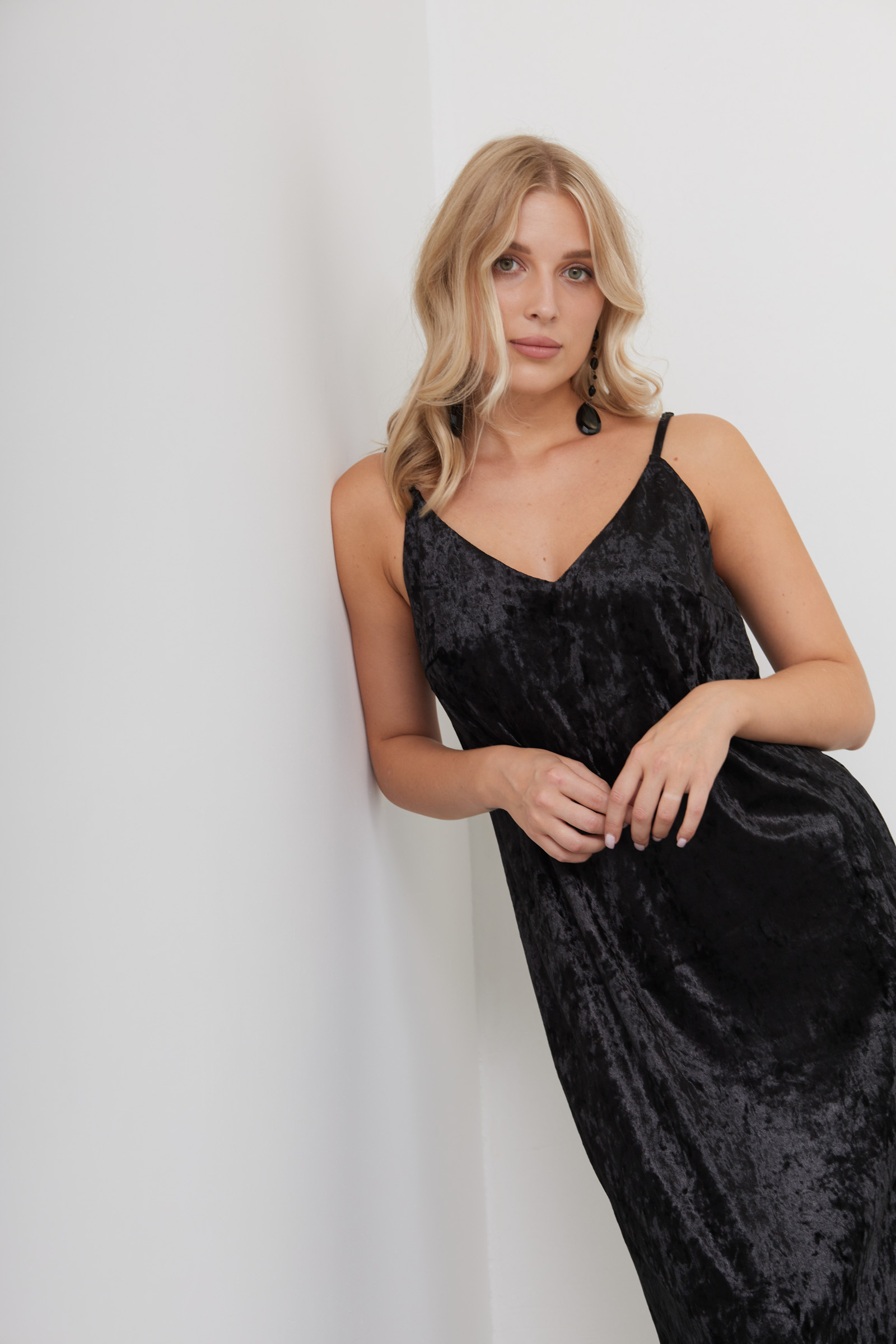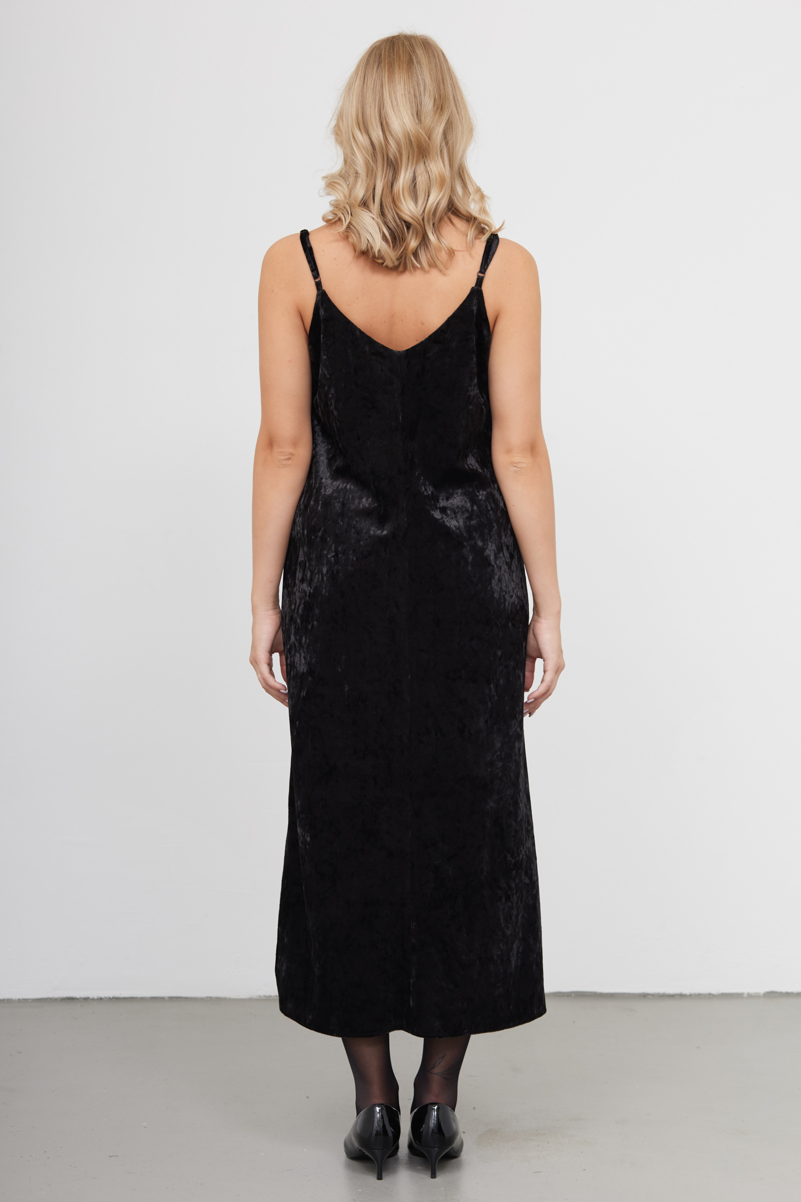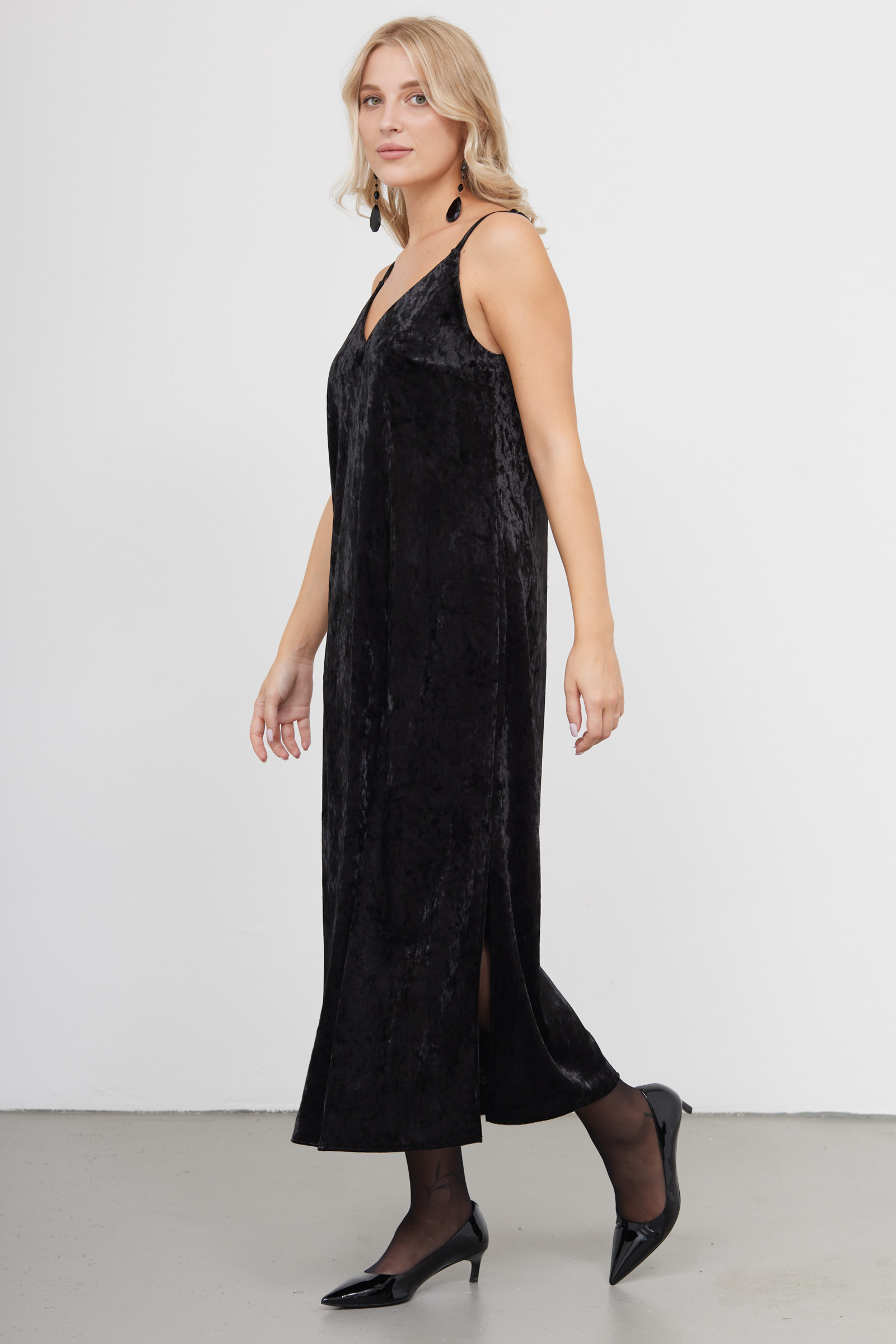Длинное бархатное платье на тонких бретелях.