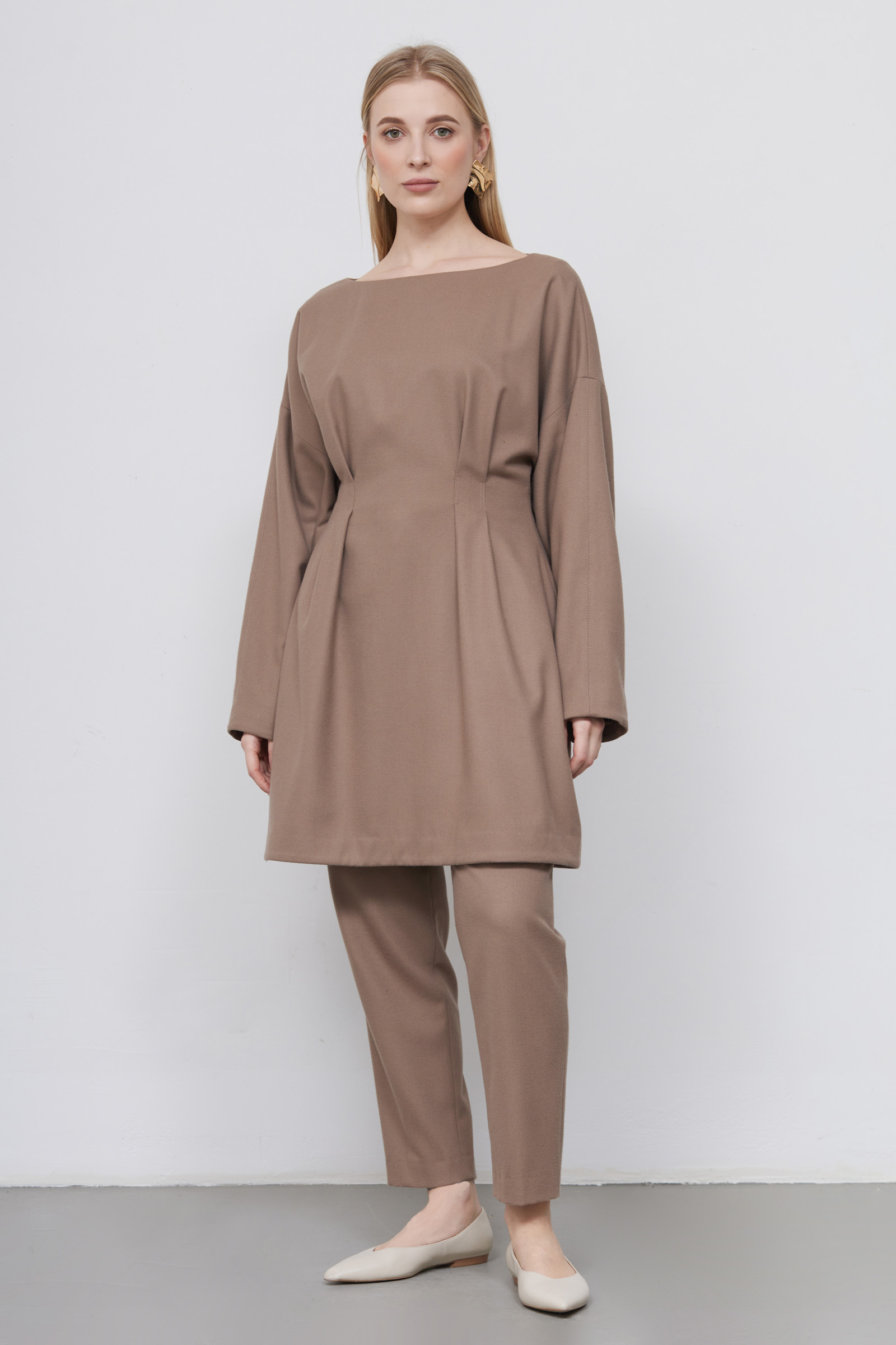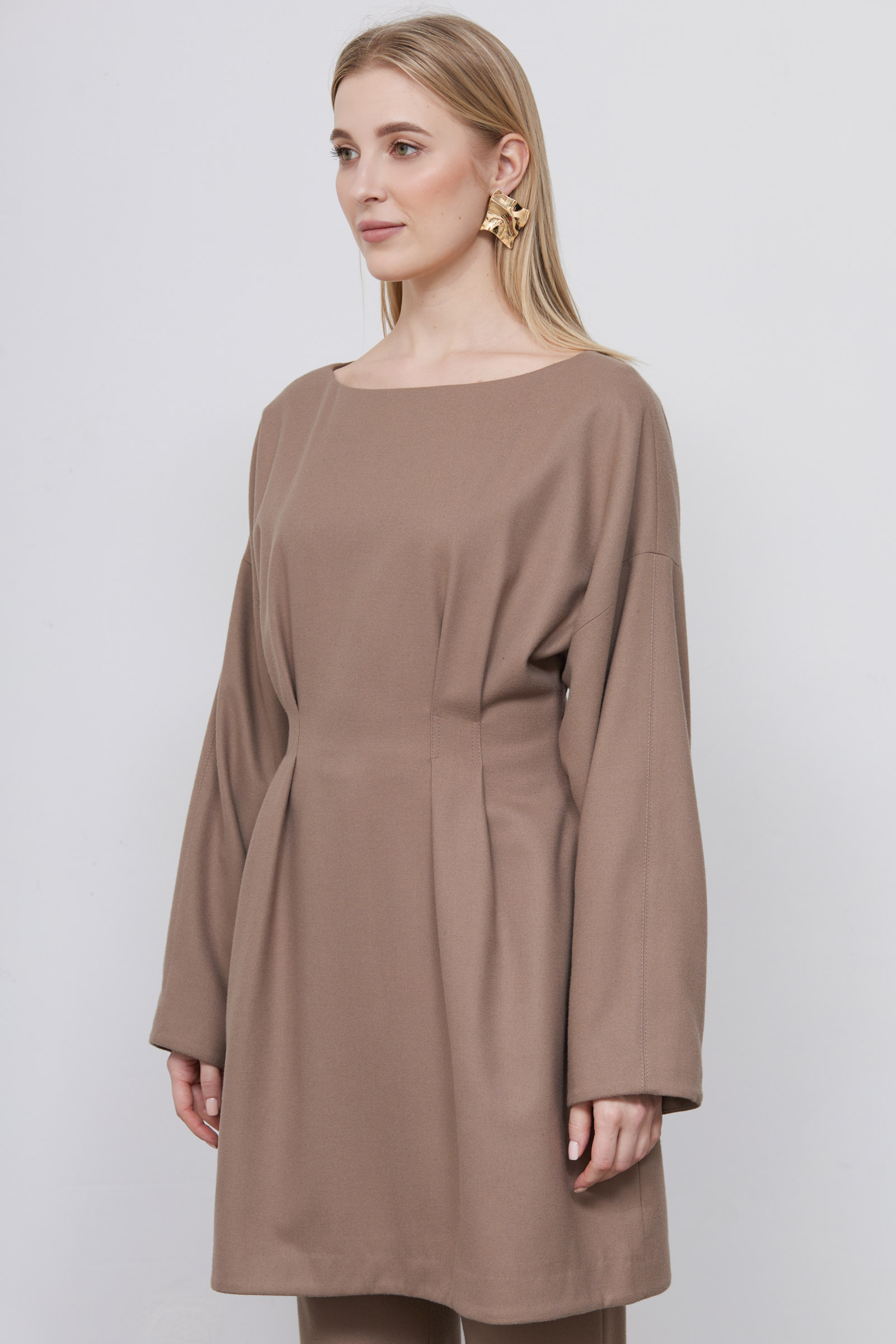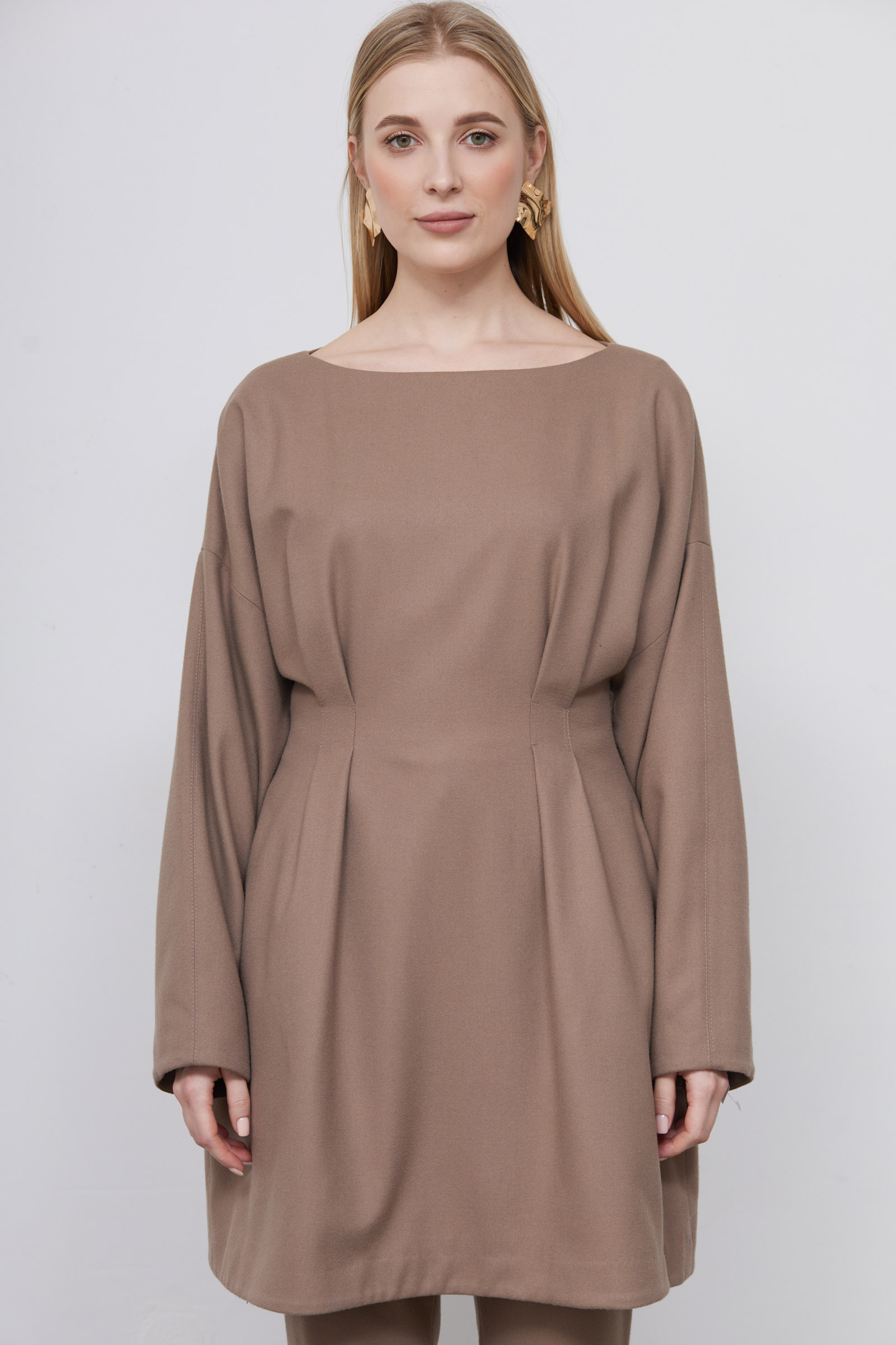 Короткое платье из мягкой фланелевой ткани с акцентом на талии.
