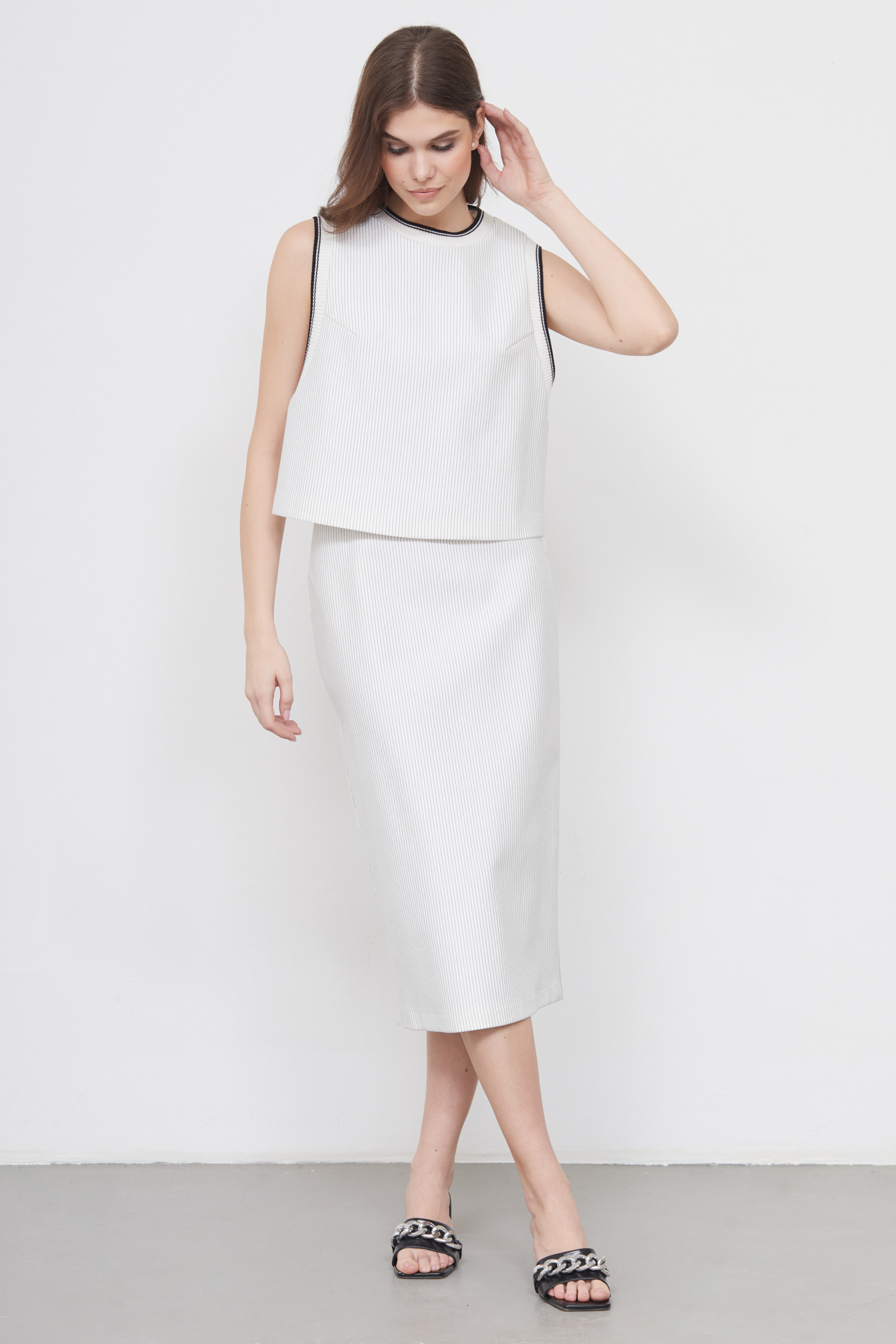 Юбка миди из плотной поливискозы в полоску на эластичном поясе.