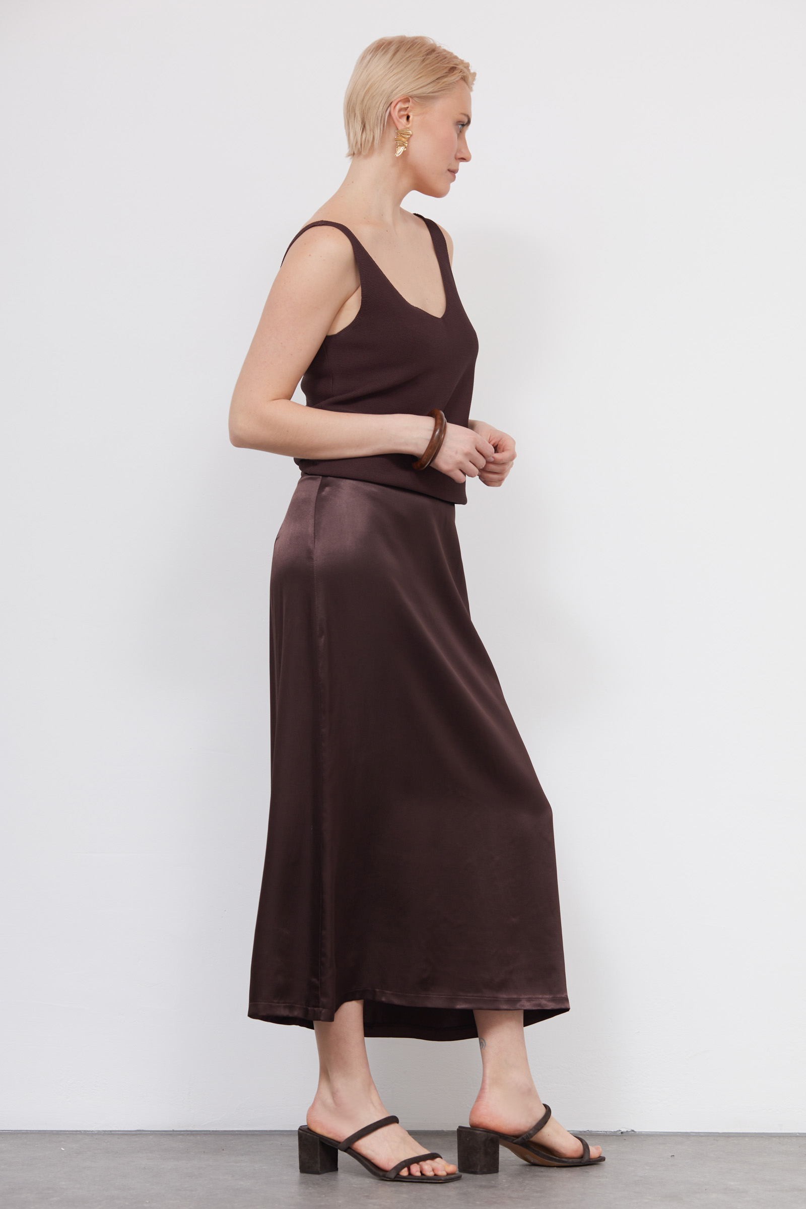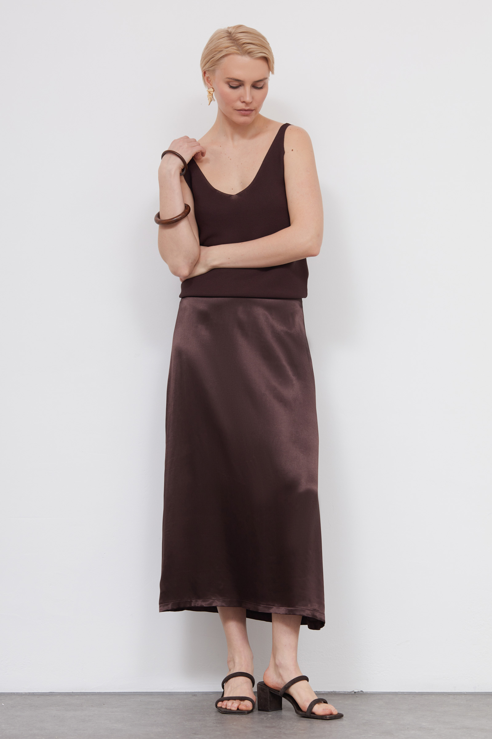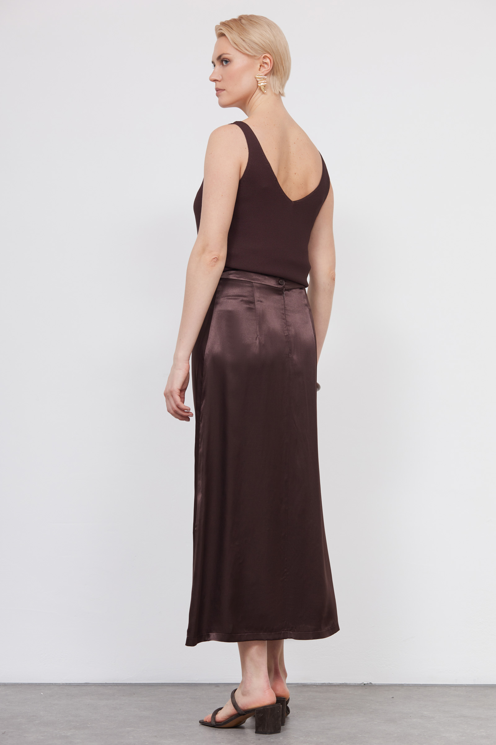 Юбка миди из вискозного атласа с отрезным поясом.