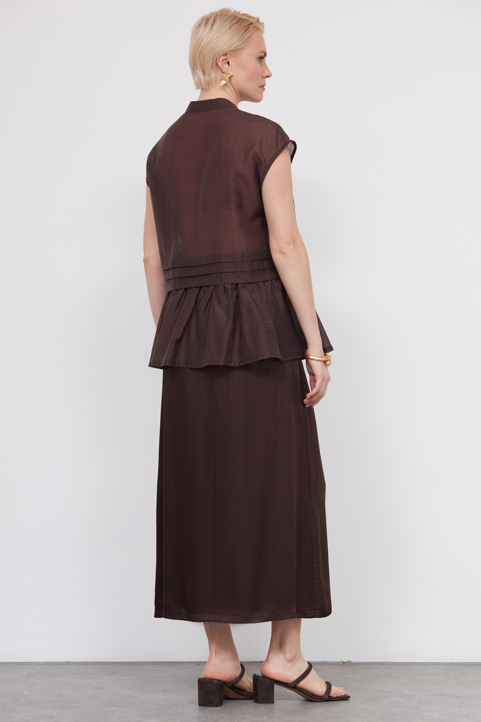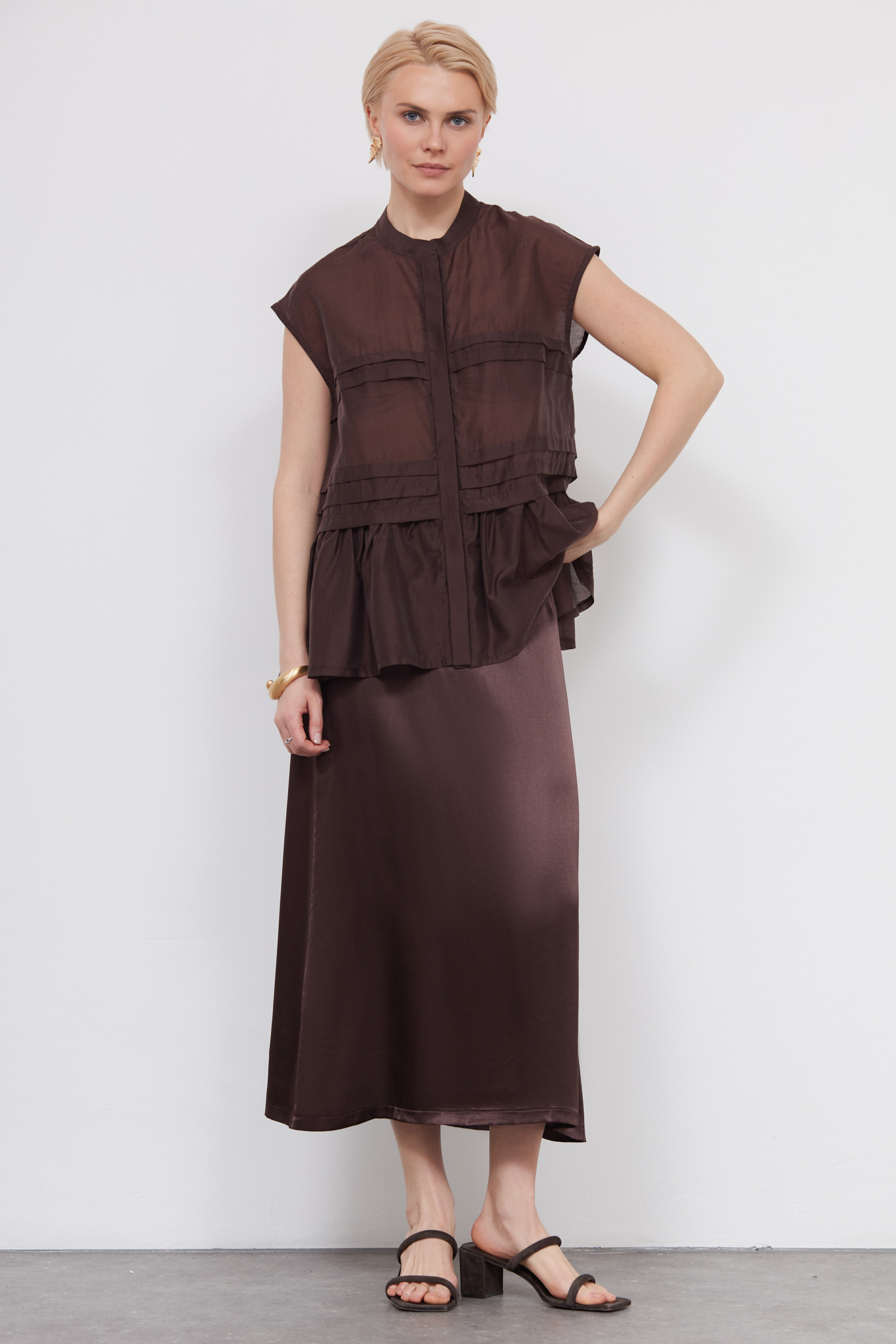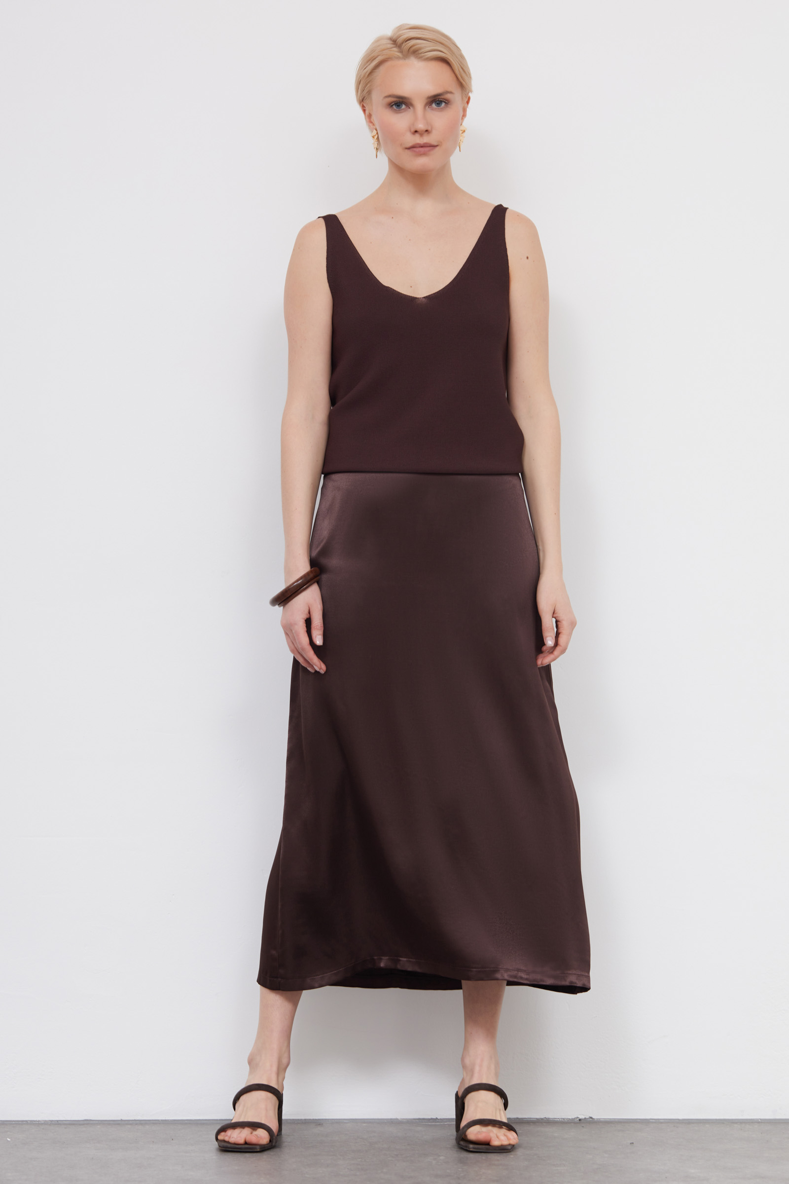 Юбка миди из вискозного атласа с отрезным поясом.