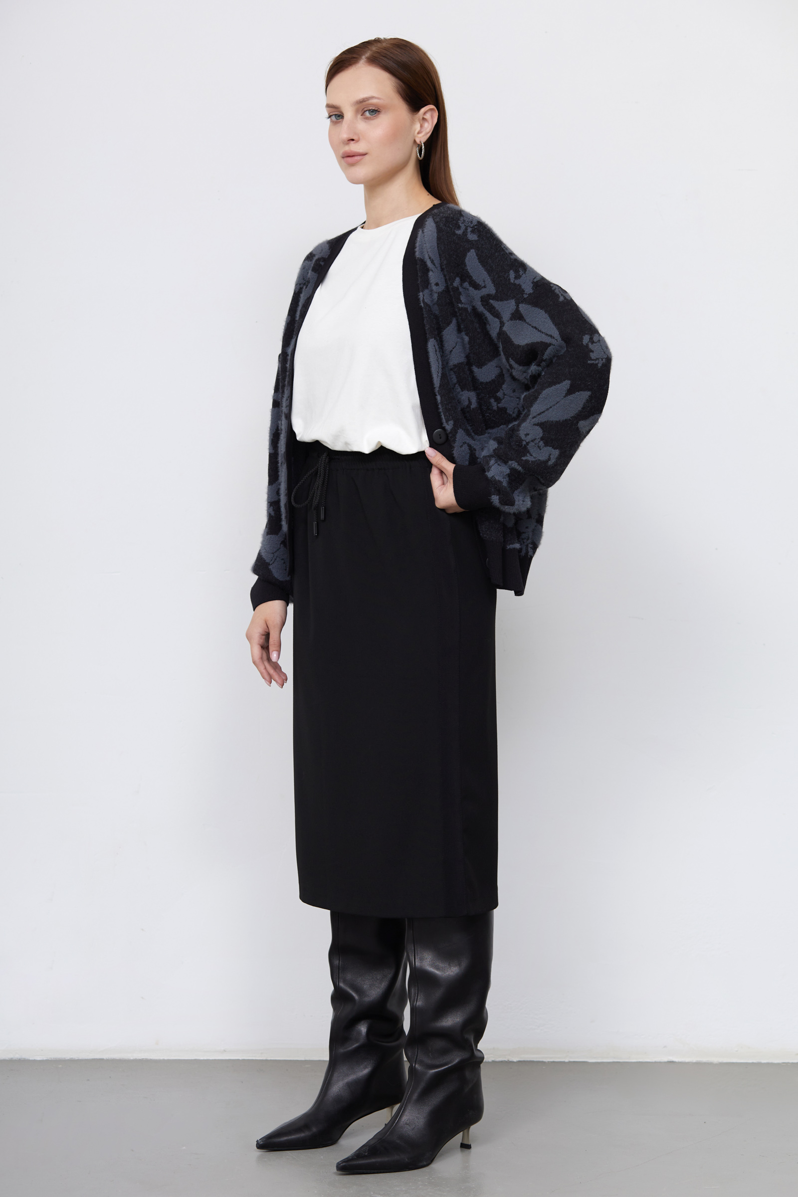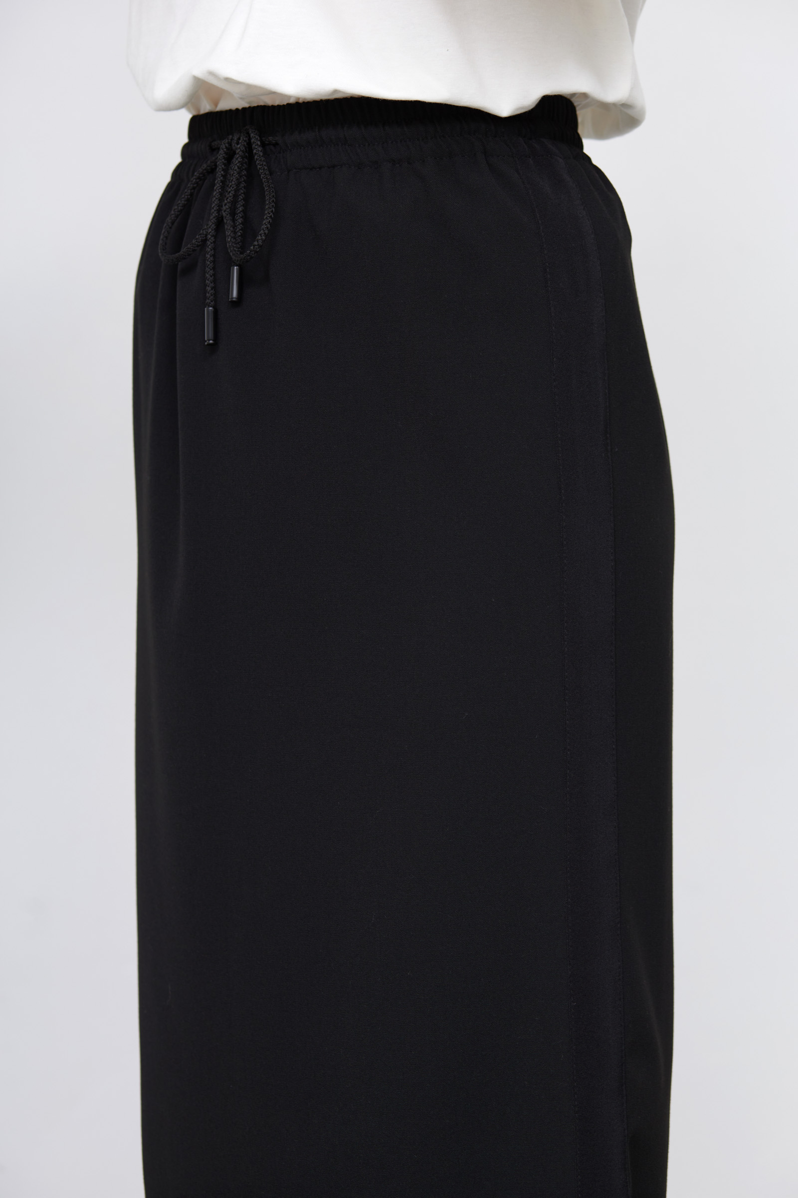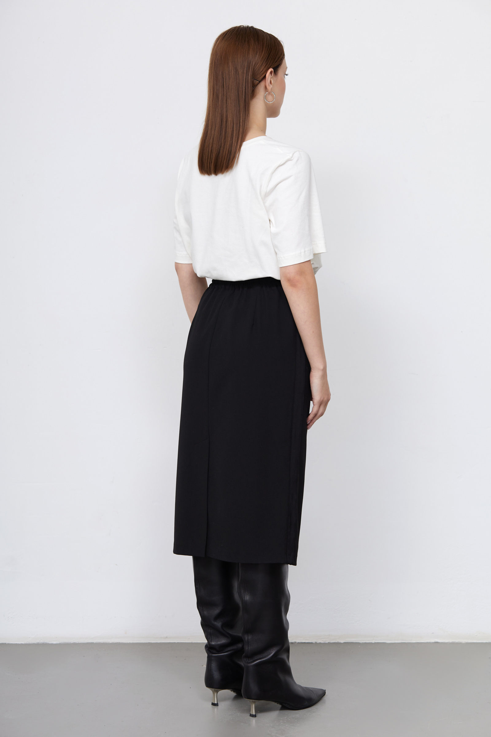 Короткая юбка-баска из костюмной ткани с фигурным низом и разрезом.