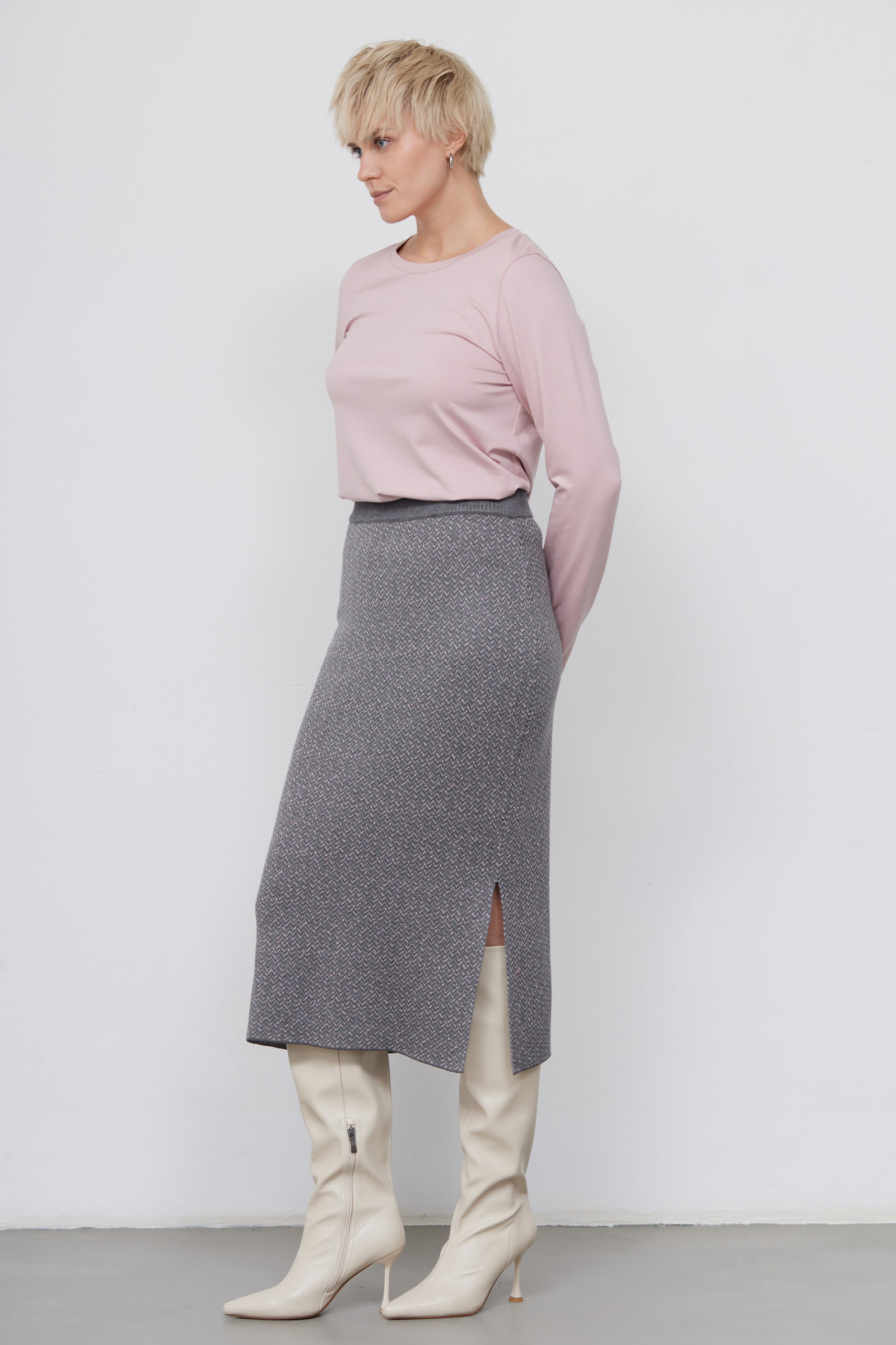 Юбка из мягкого трикотажа жаккардовой вязки с люрексом.