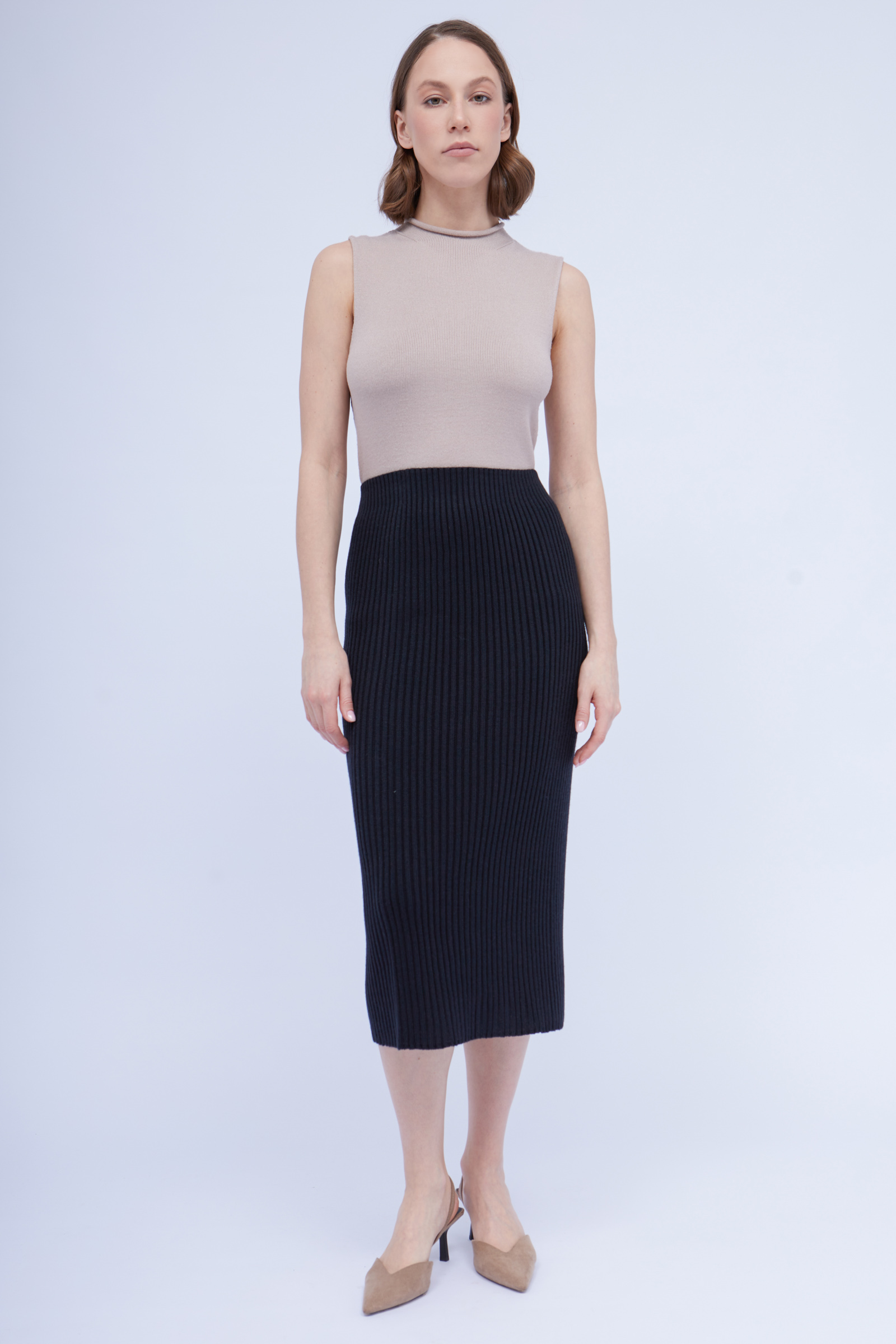 Юбка миди из вязаного трикотажа в рубчик.