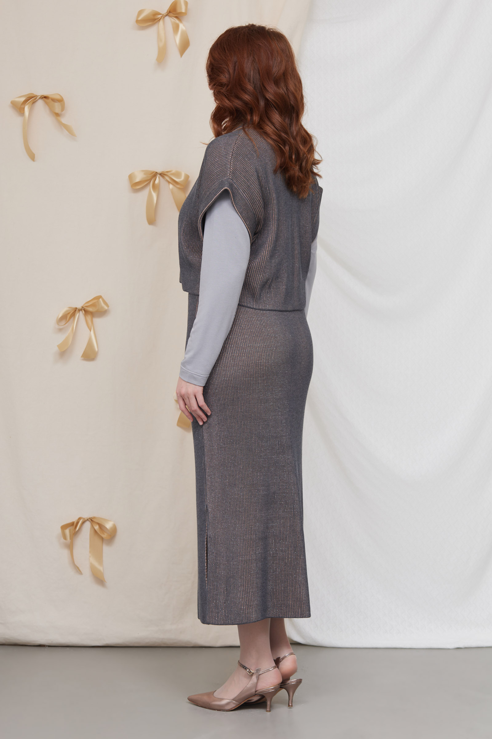 Юбка миди из вязаного трикотажа в рубчик с люрексом.