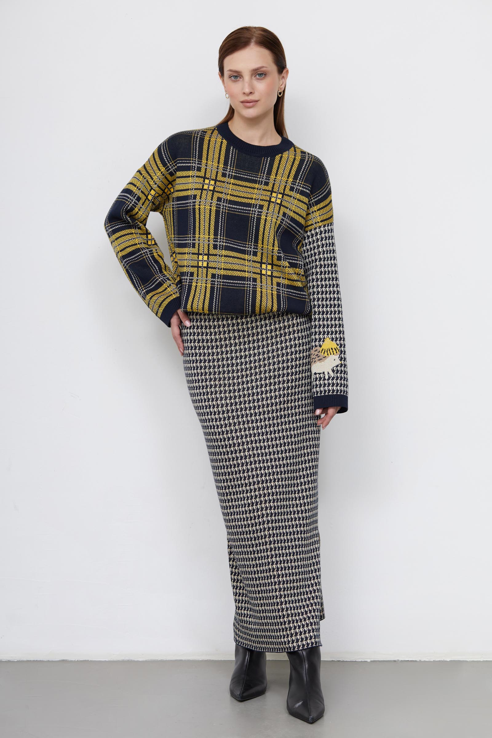 Длинная юбка жакккардовой вязки с принтом "пье-де-пуль".