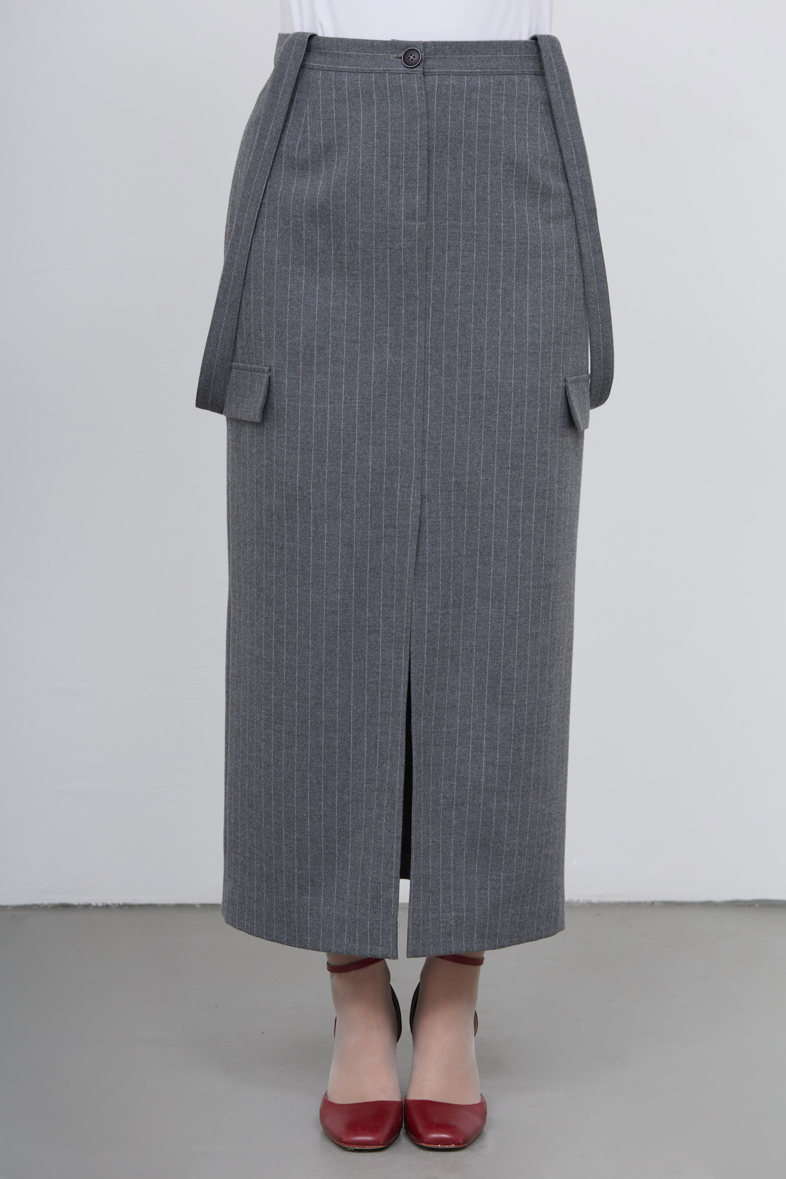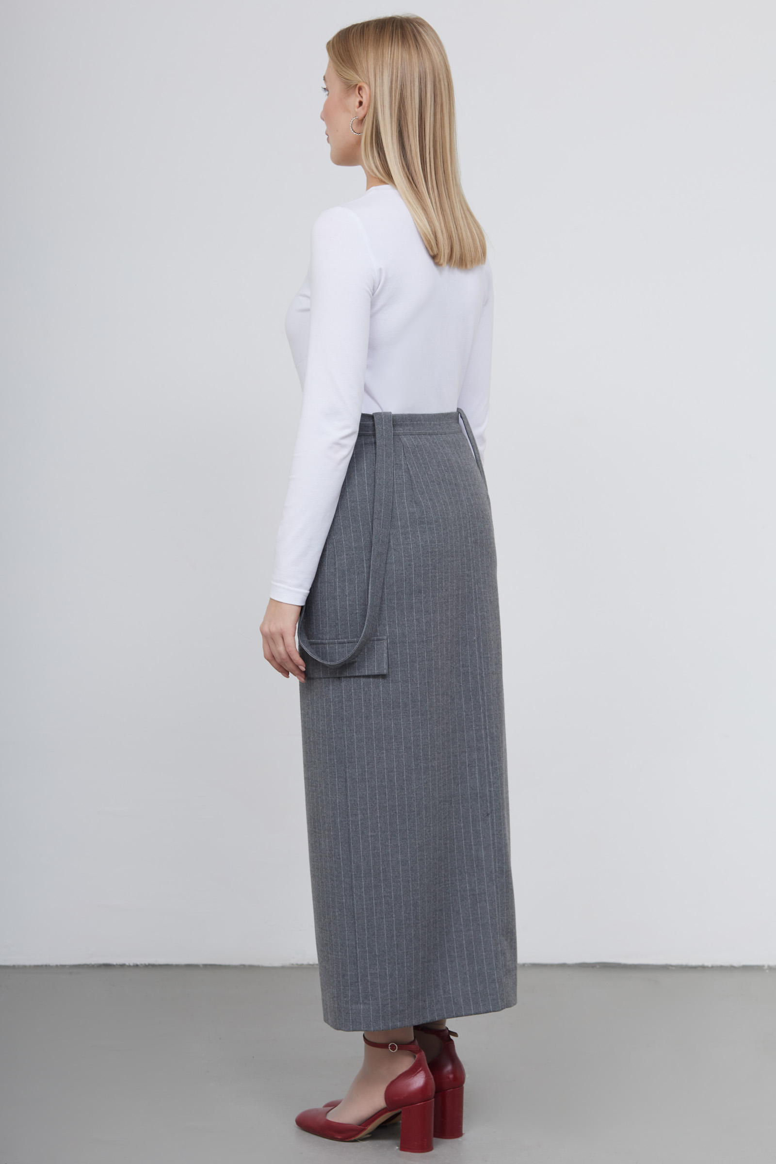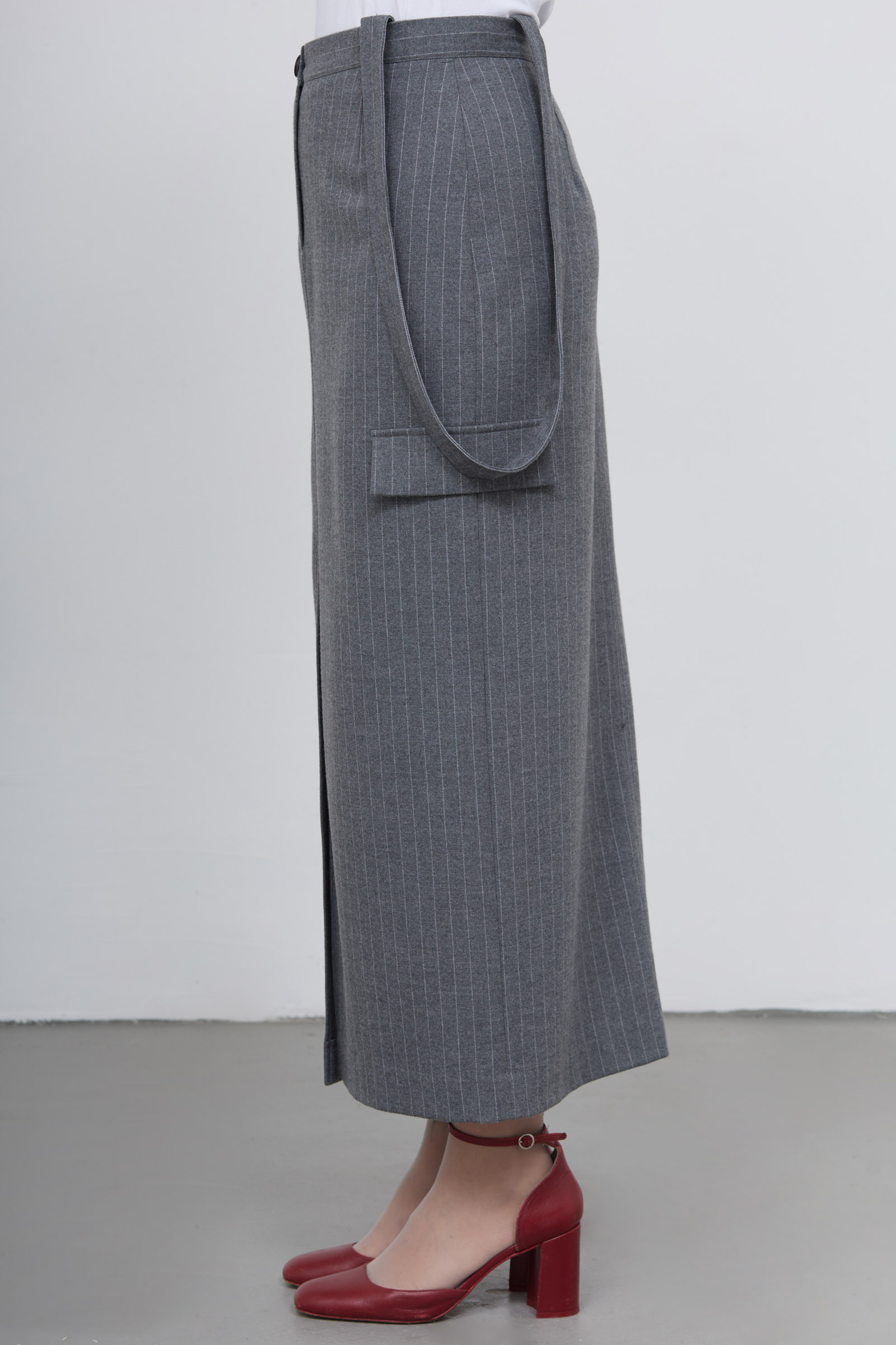 Длинная юбка карго в полоску из смесовой шерсти с разрезом и декоративными лямками.