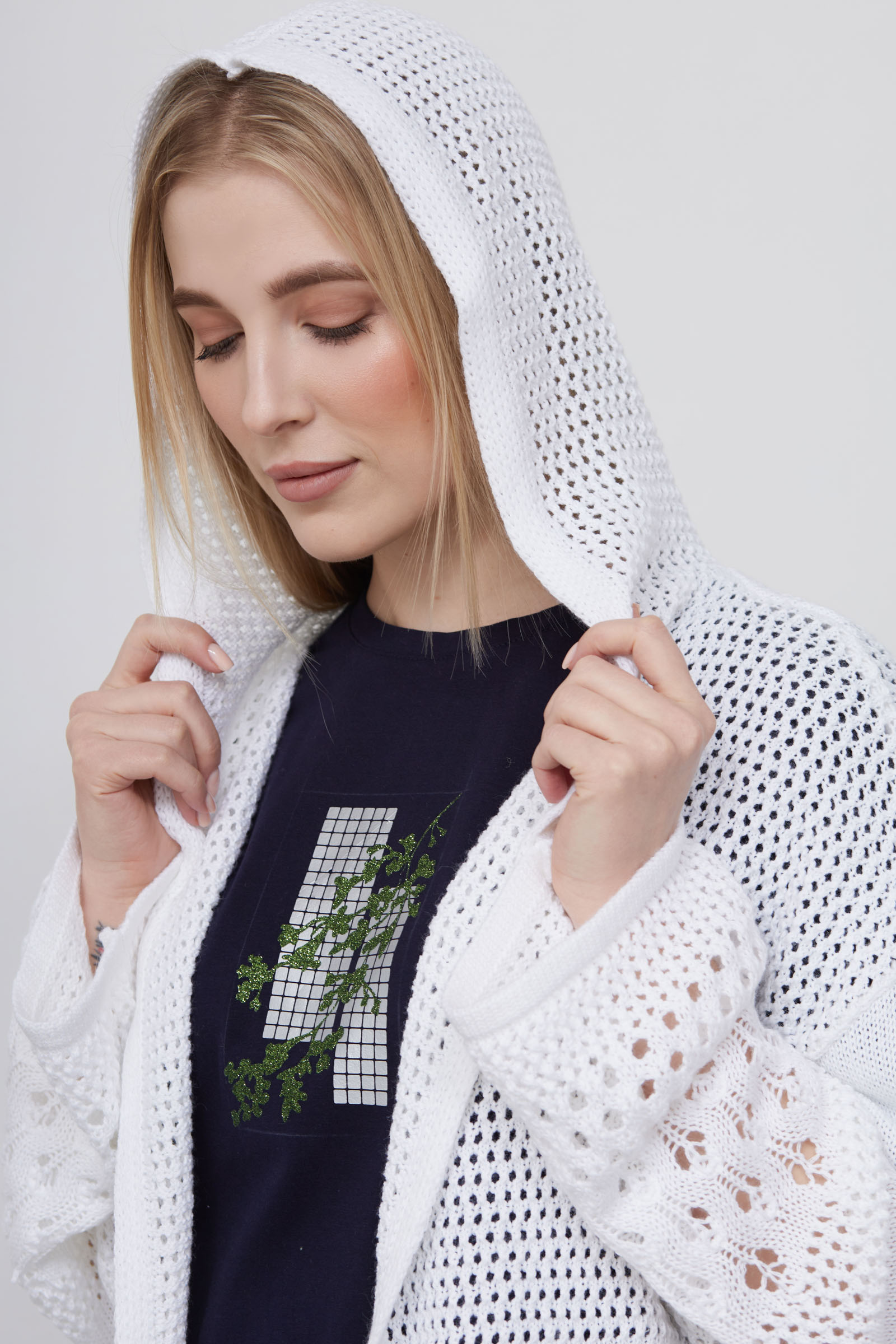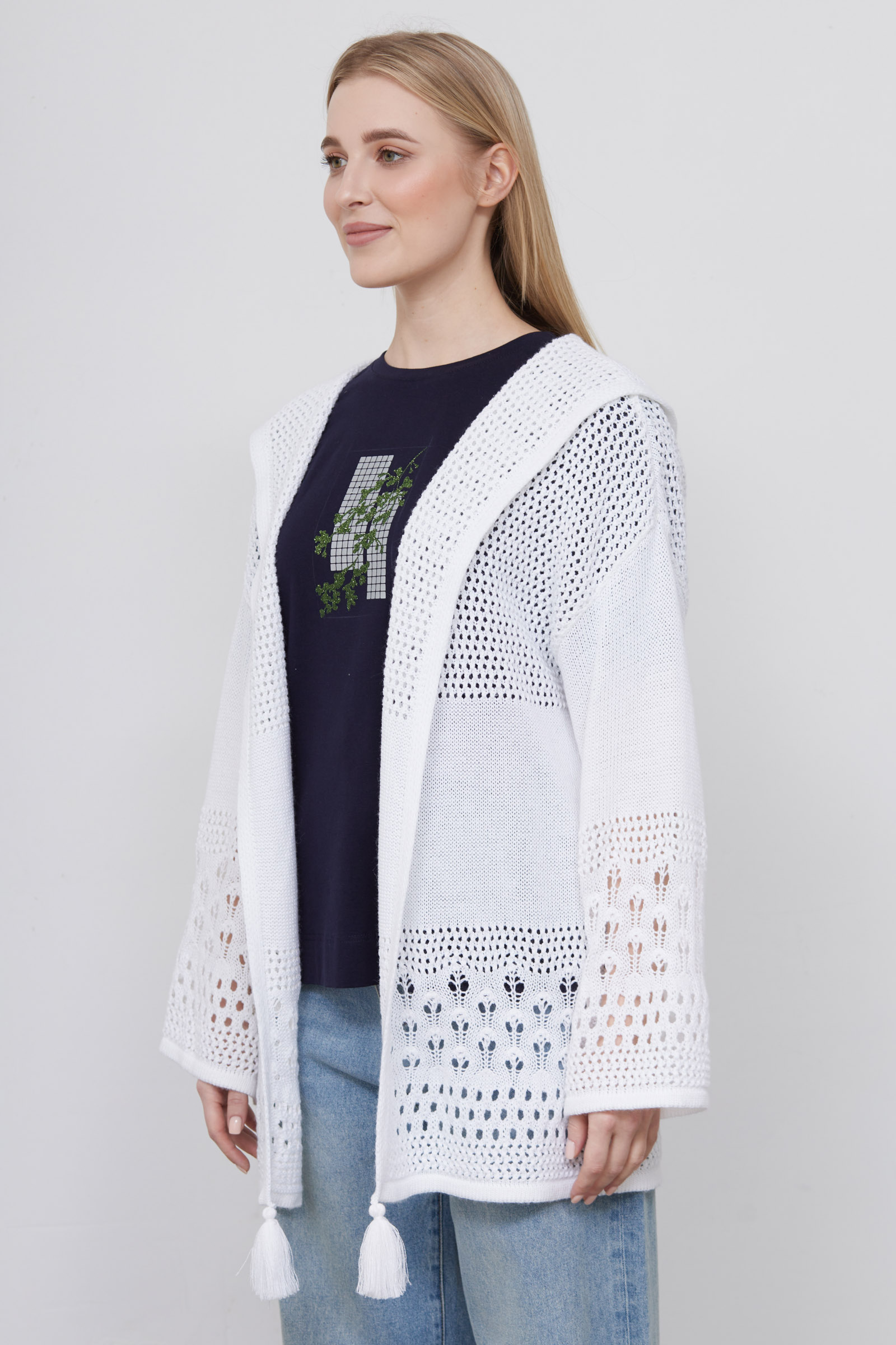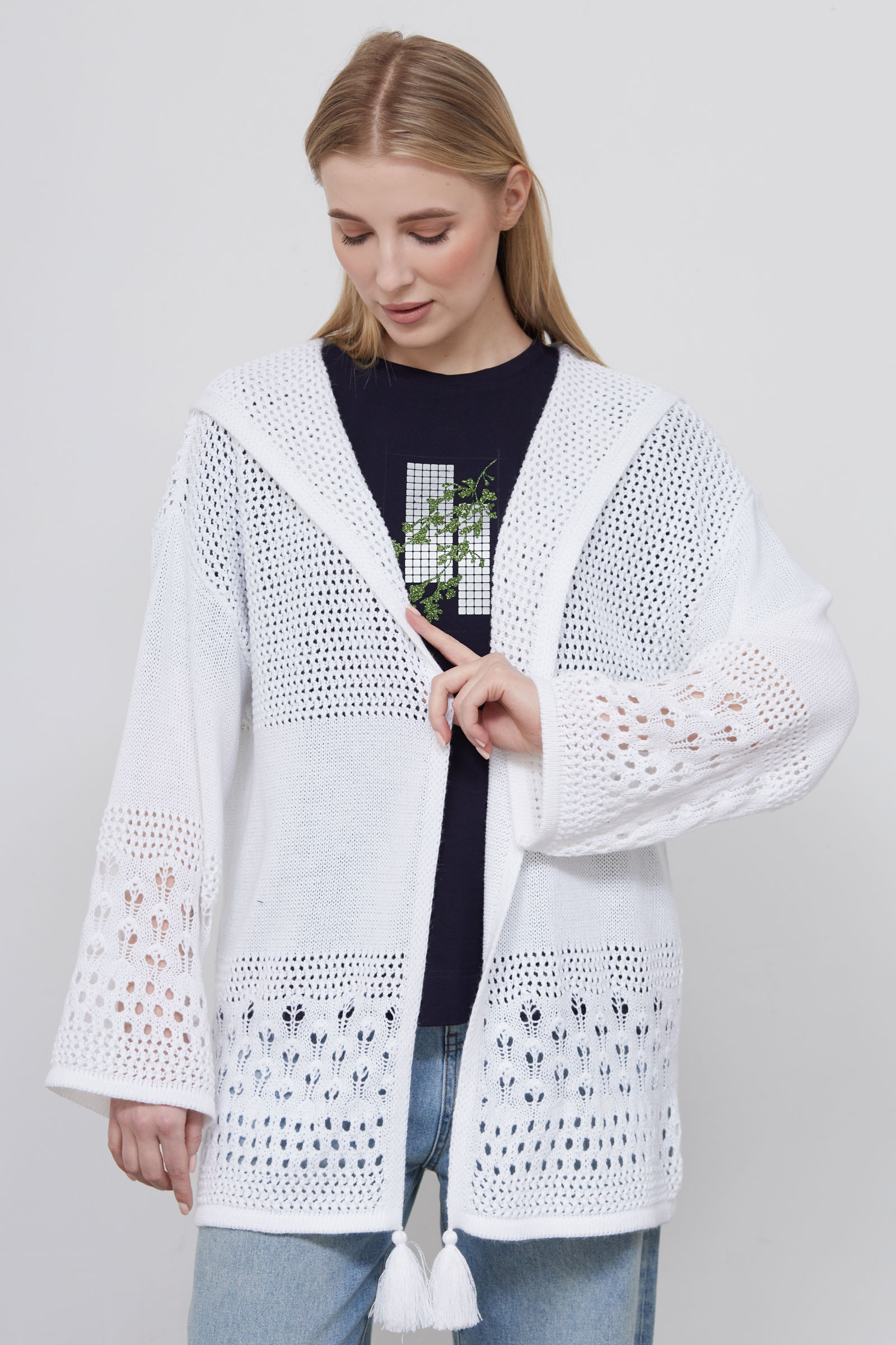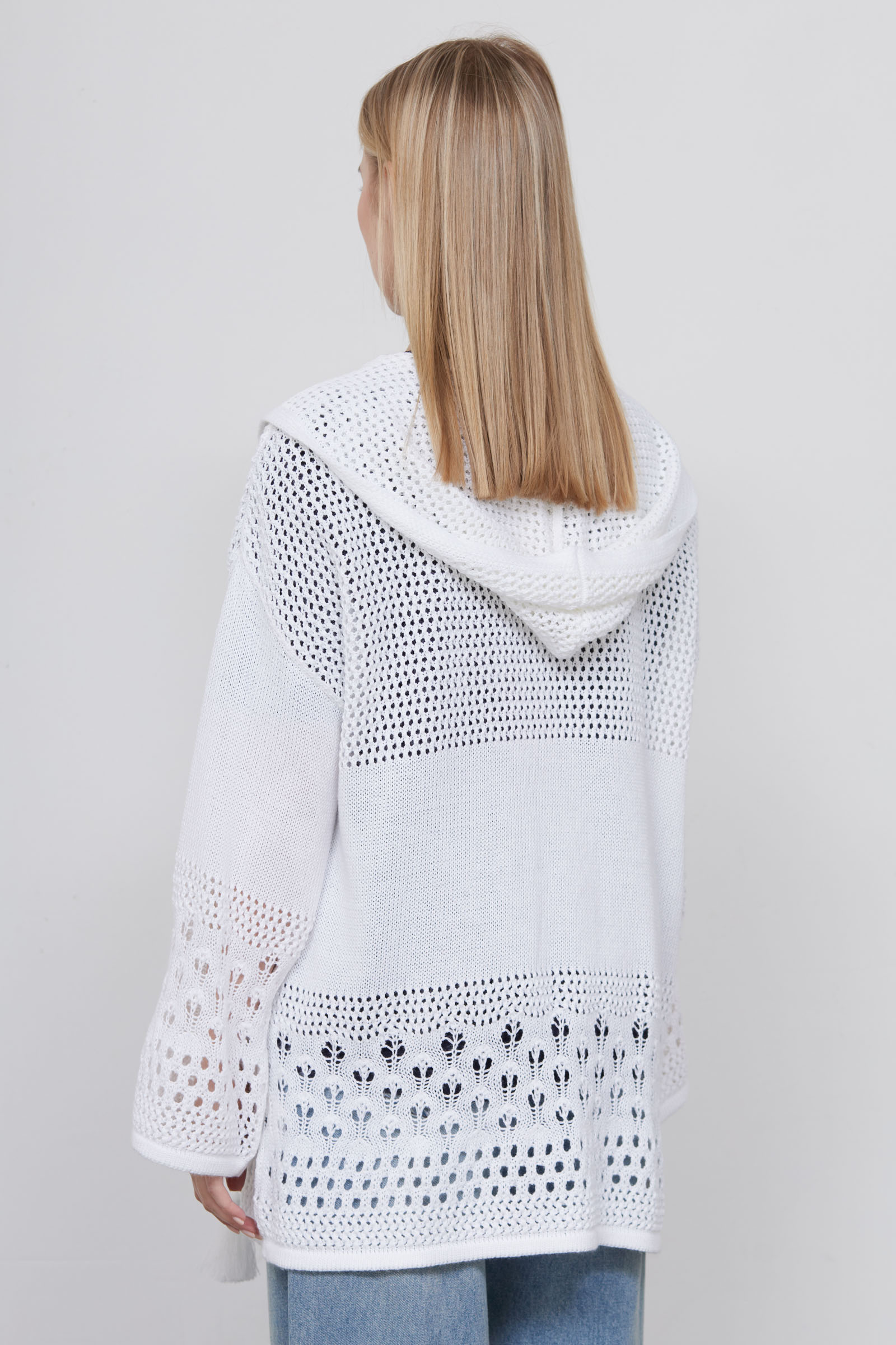 Удлиненный кардиган oversize ажурной вязки с капюшоном и декором.