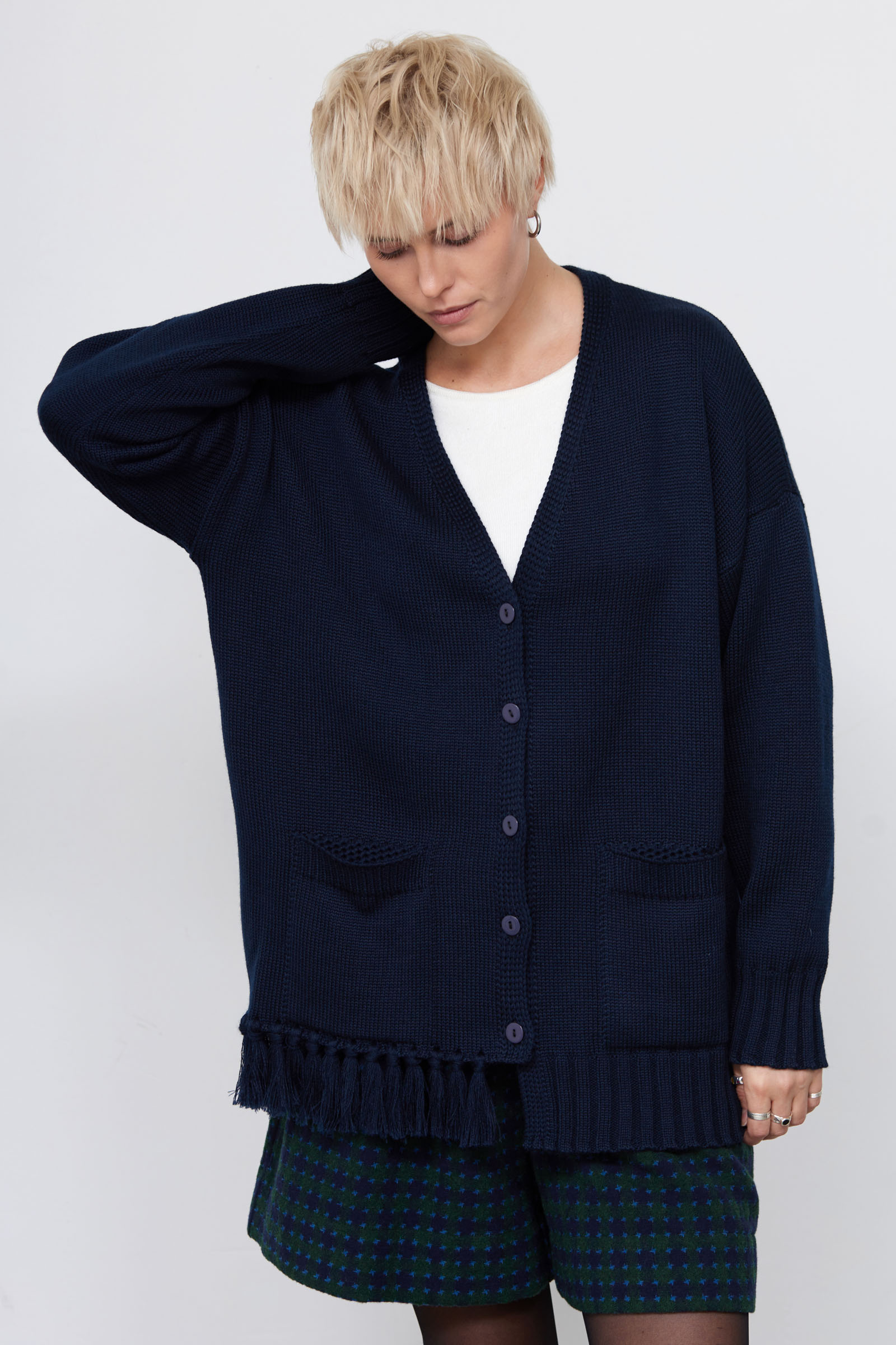 Кардиган oversize из мягкого вязаного трикотажа с шерстью и декором в виде кисточек.