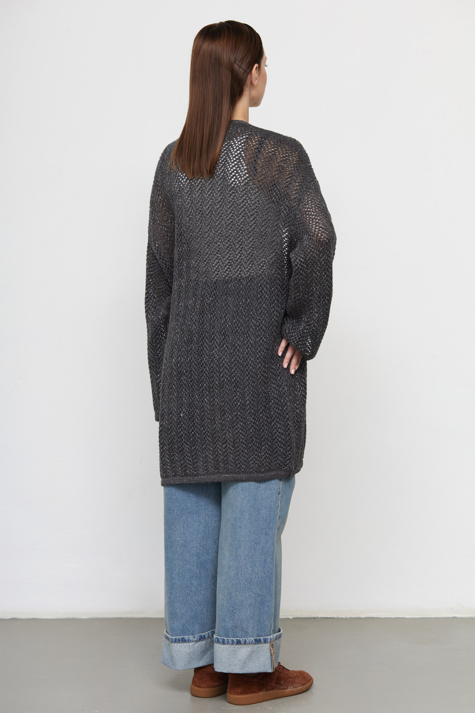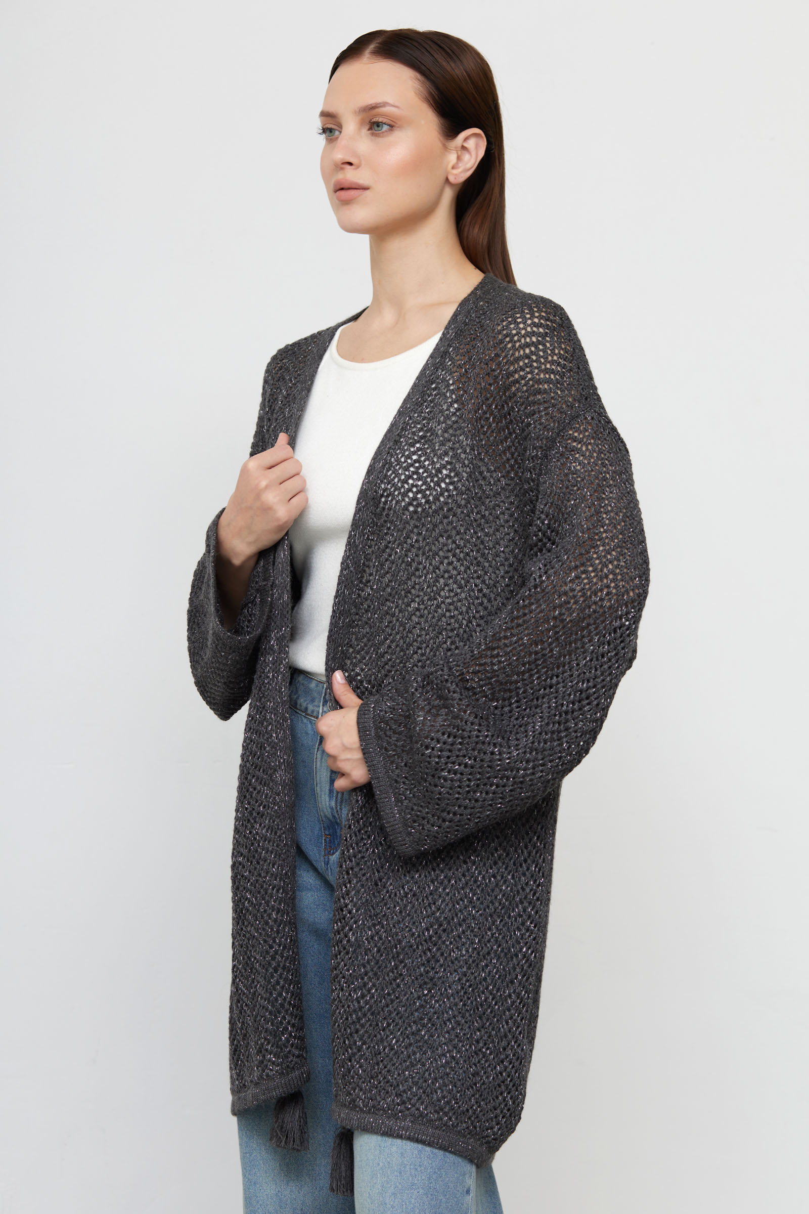 Удлиненный кардиган oversize из смесовой шерсти ажурной вязки с люрексом и декором.
