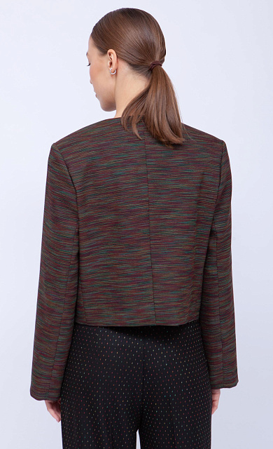 Жакет из поливискозы с принтом "пье-депуль", отлетной кокеткой и декоративными завязками.