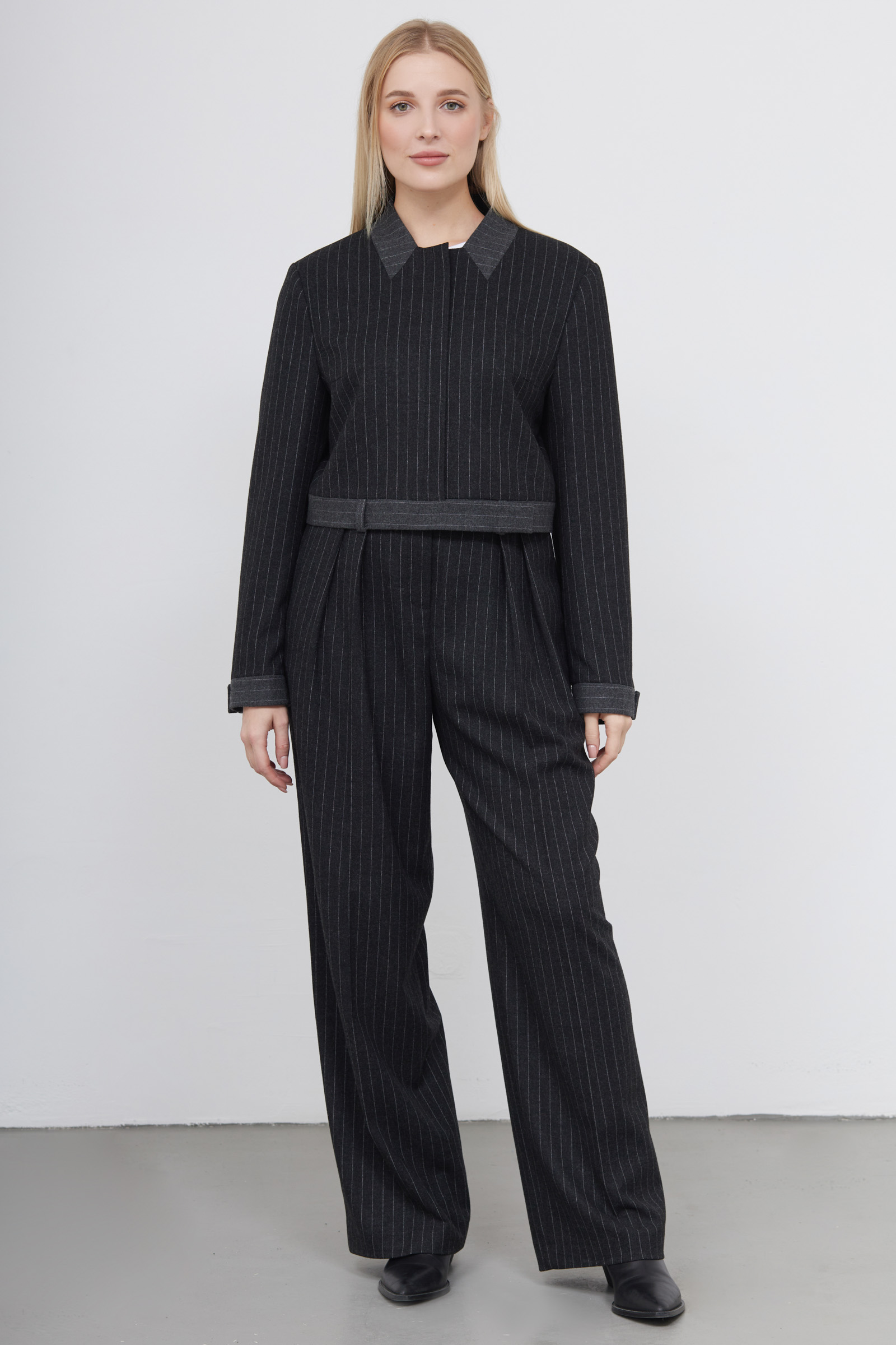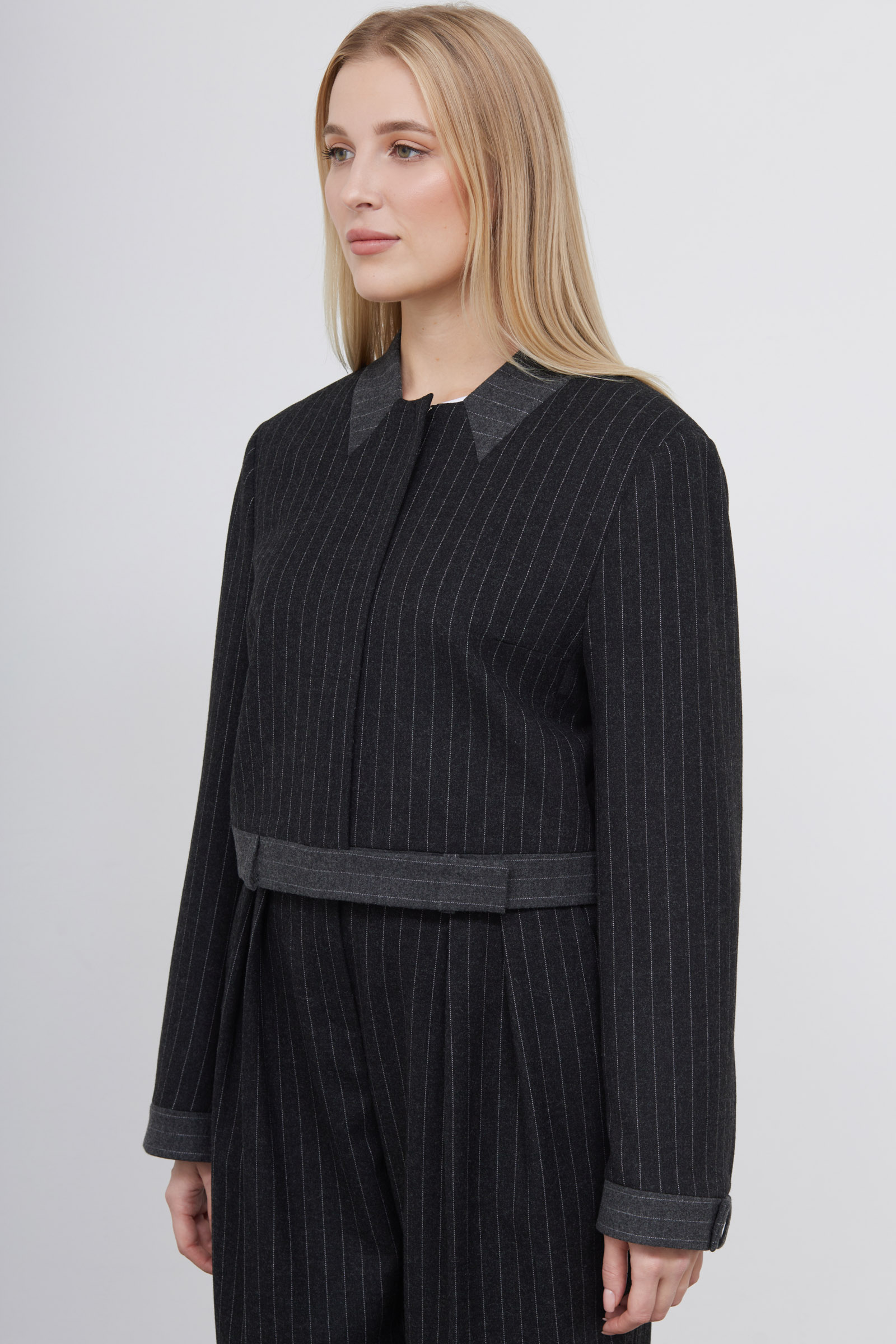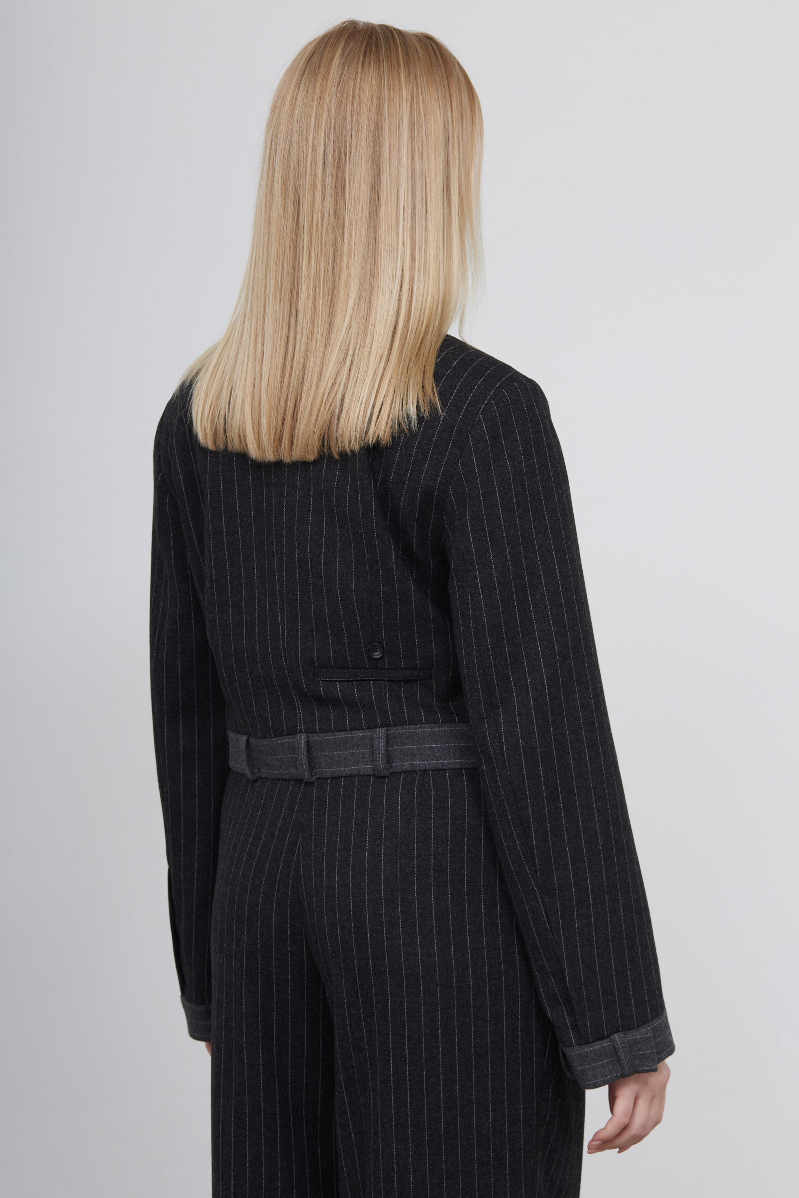 Укороченный жакет в полоску из смесовой шерсти с имитацией перевернутых брюк на спинке.
