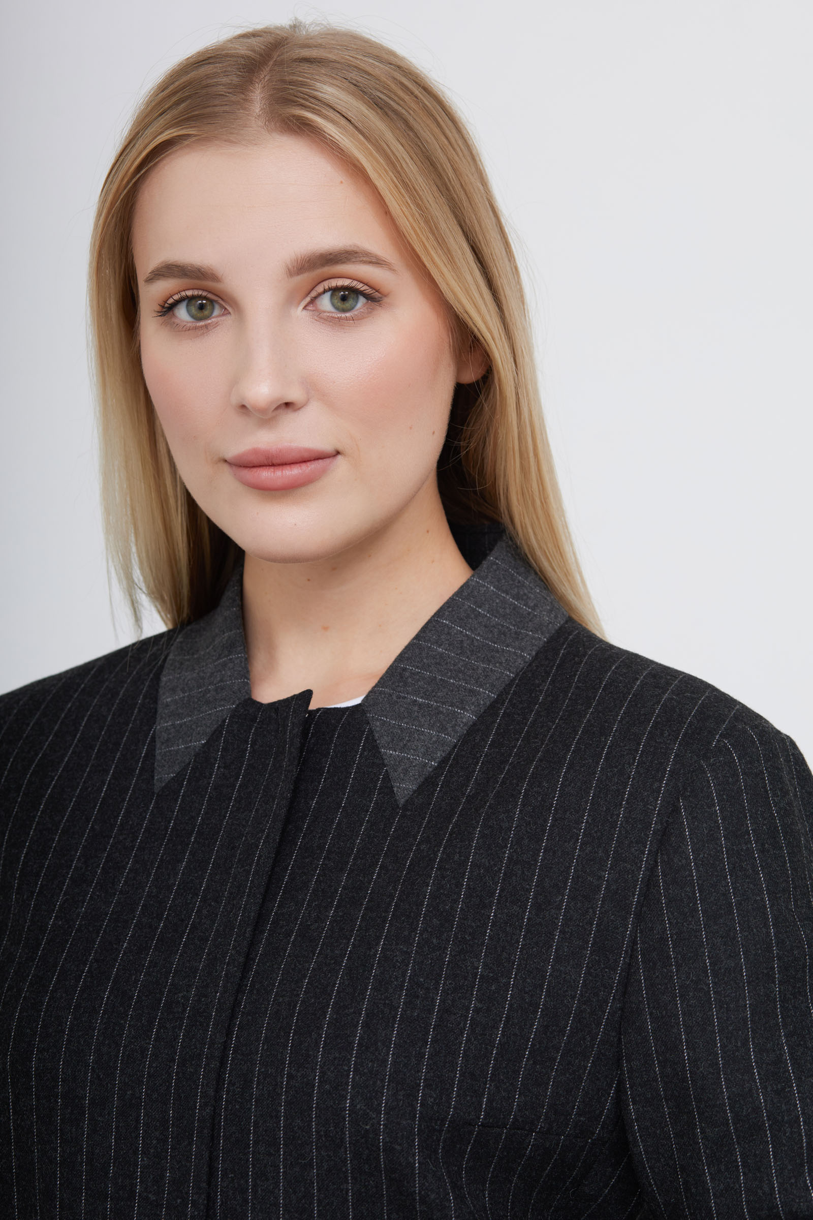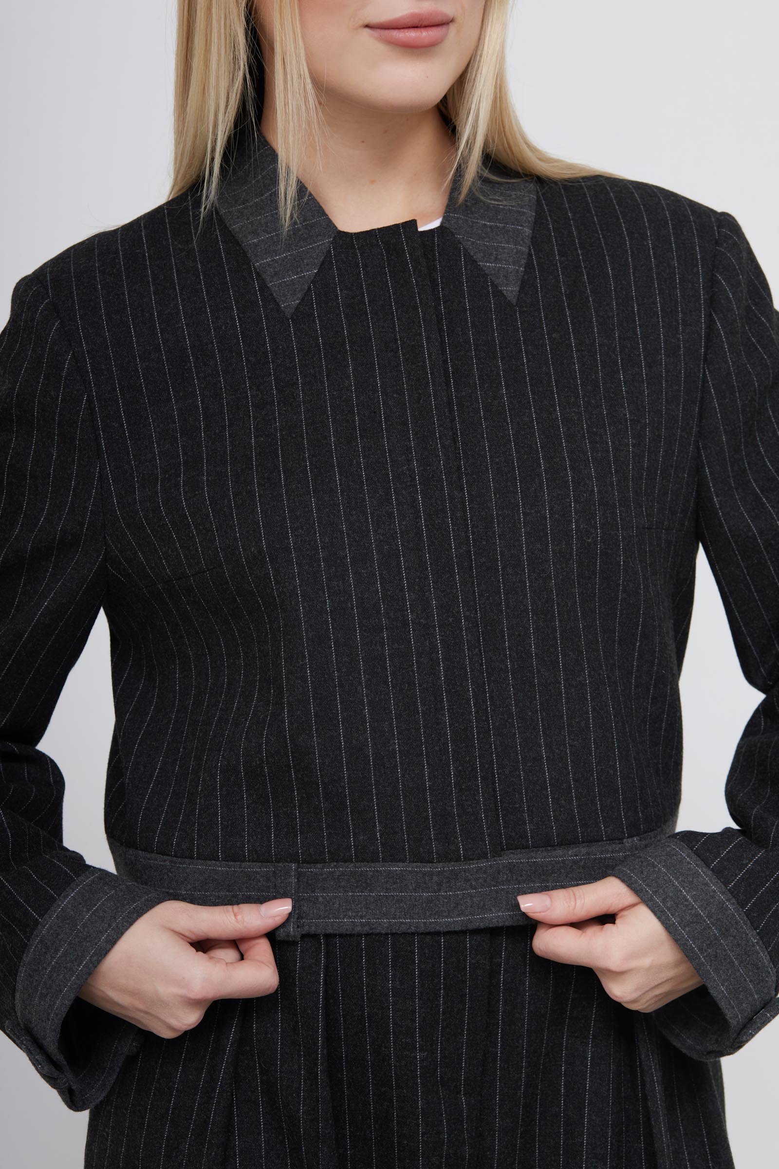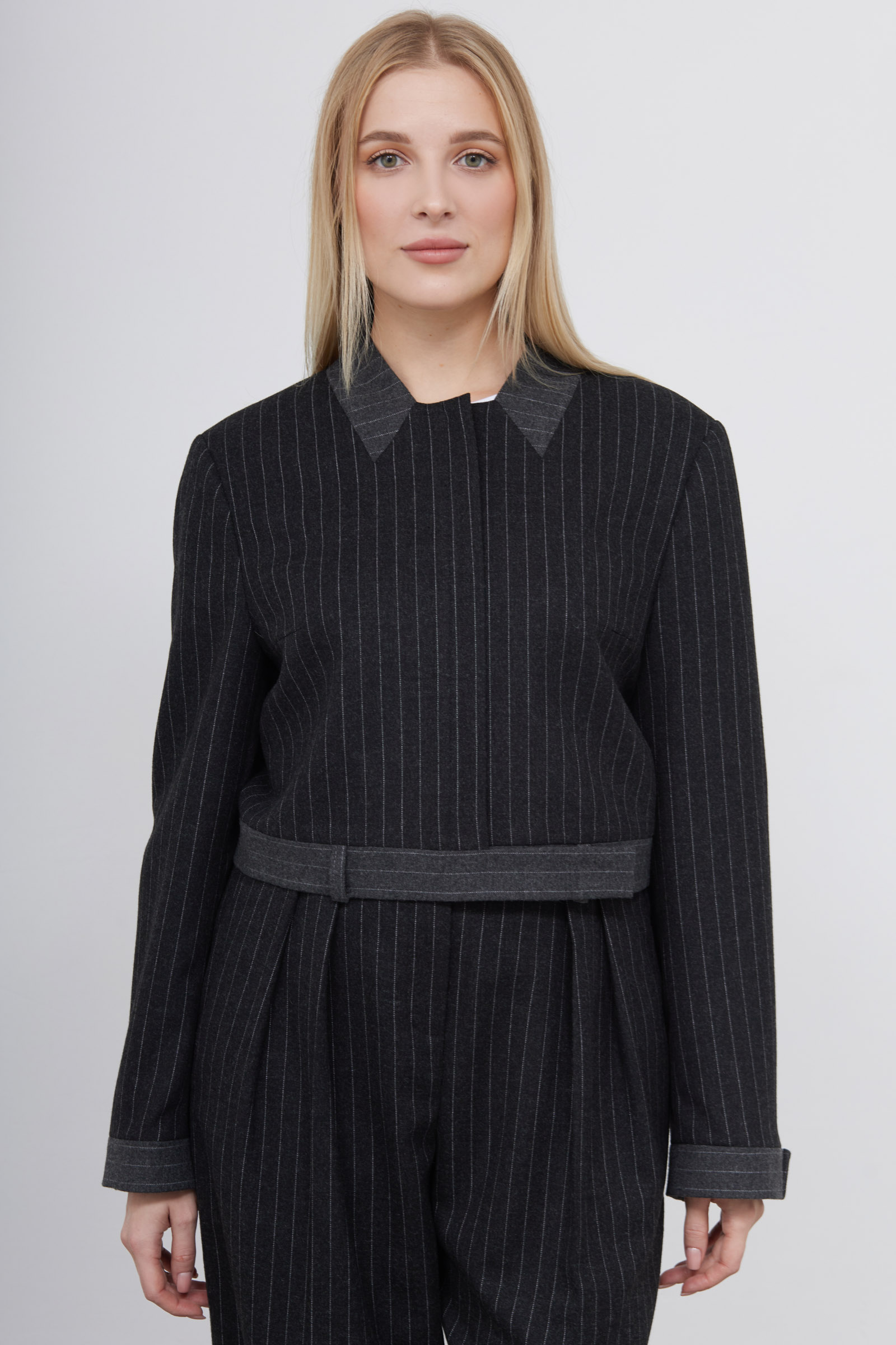 Укороченный жакет в полоску из смесовой шерсти с имитацией перевернутых брюк на спинке.