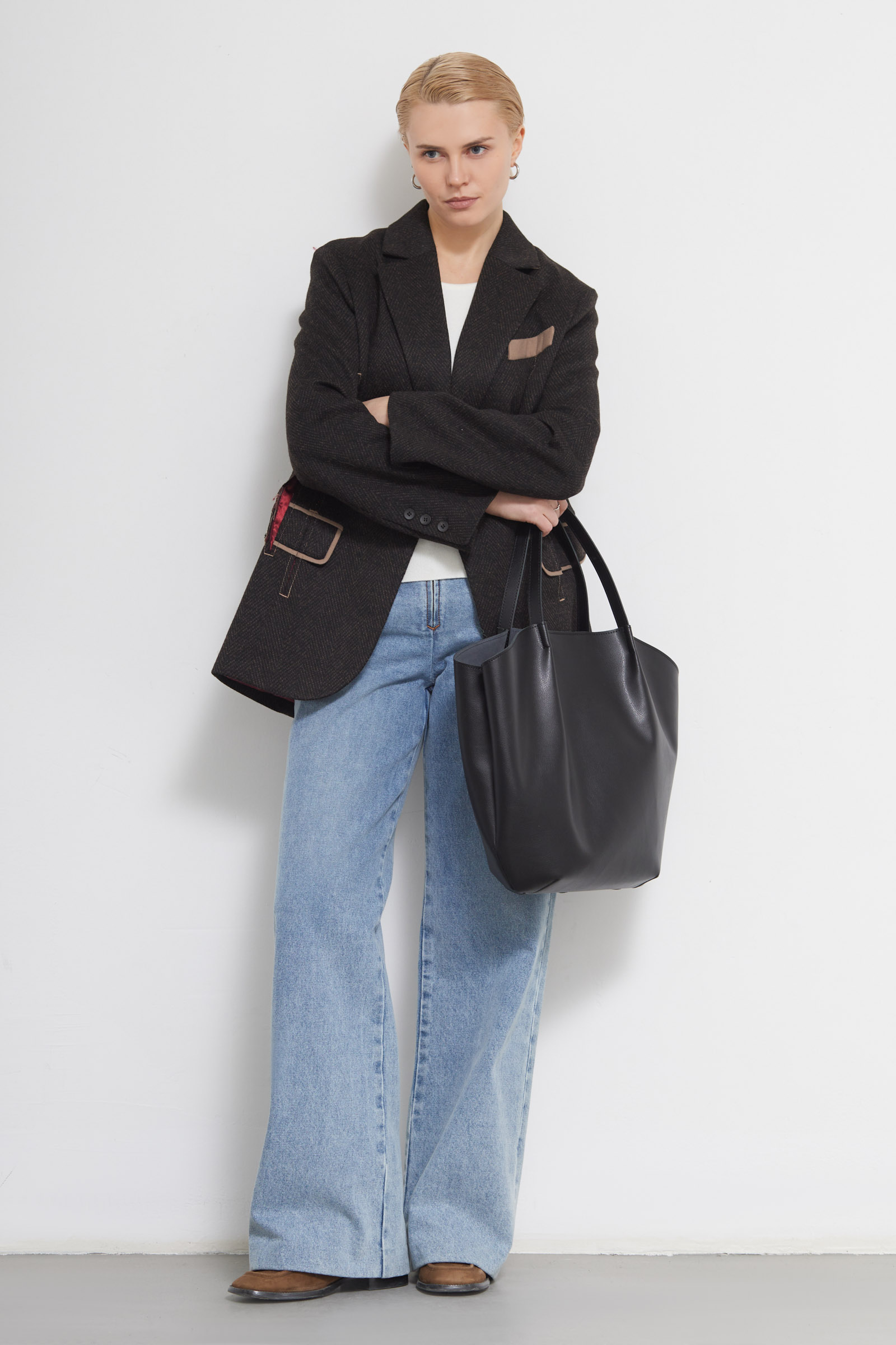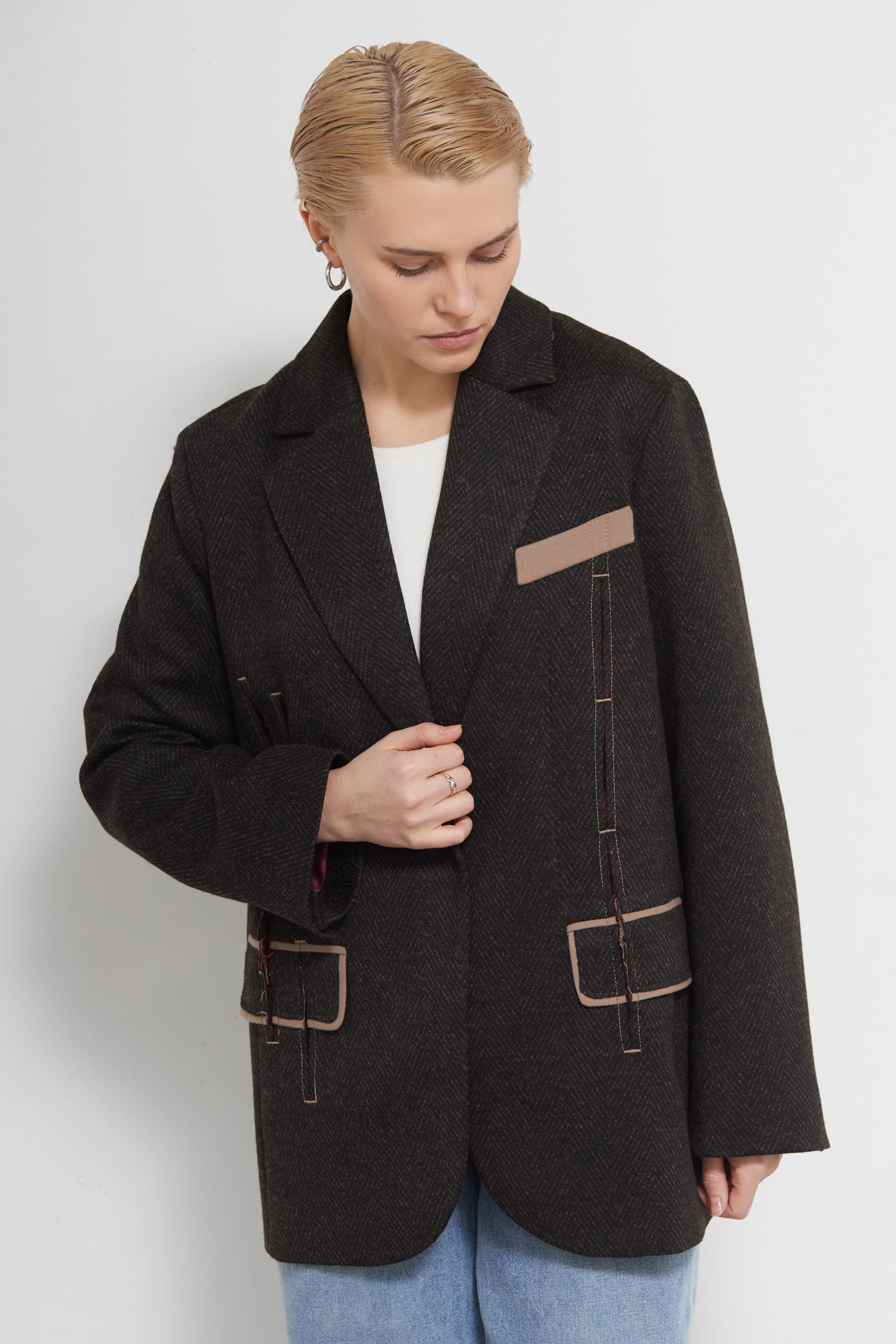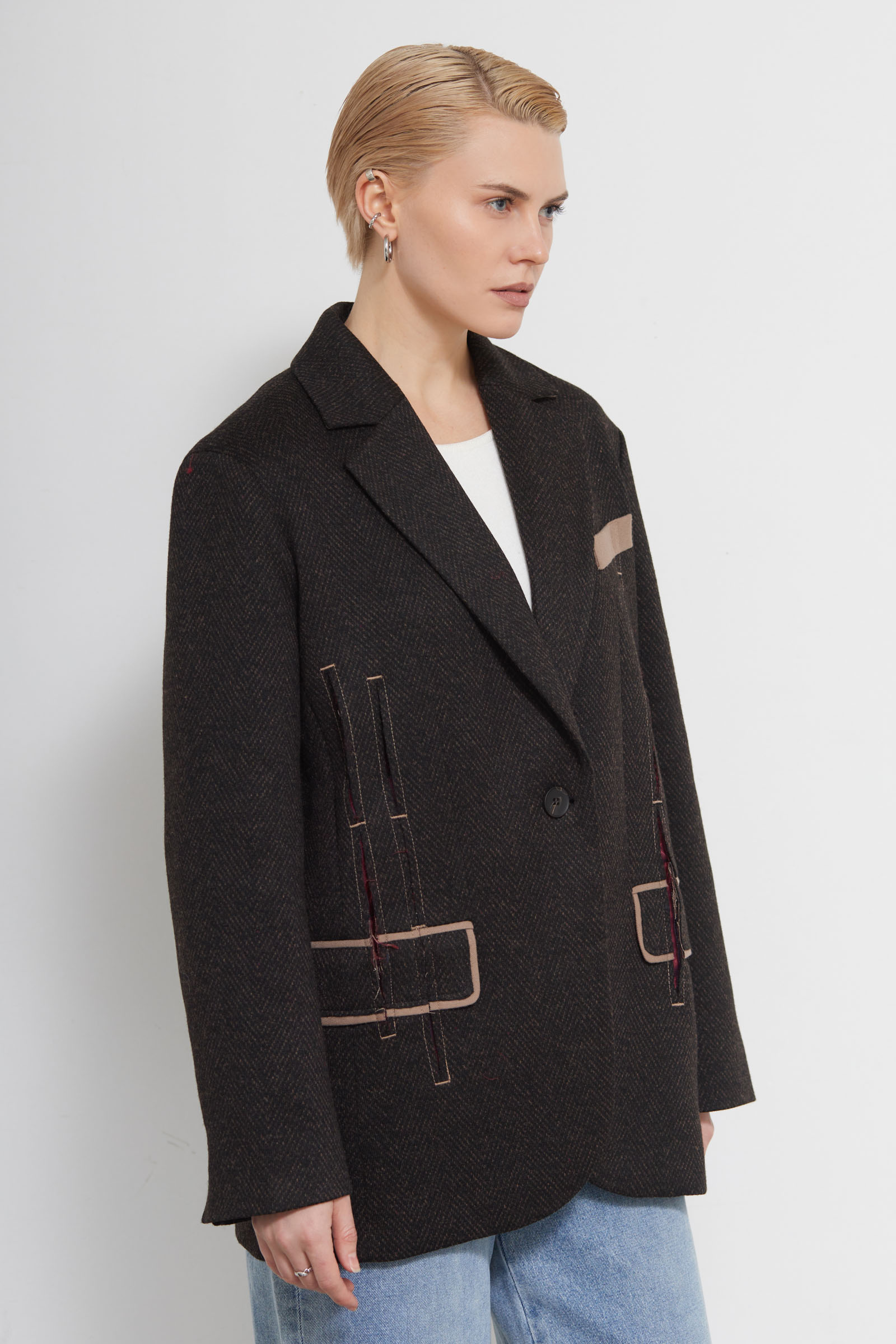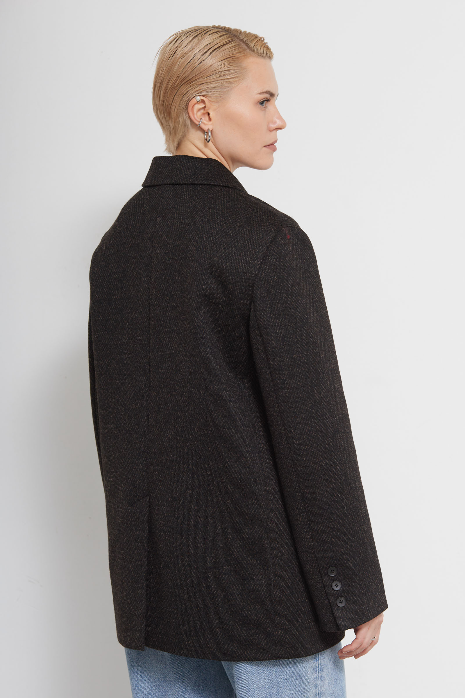 Жакет из меланжевой костюмной ткани в елочку с декоративными разрезами и ложными карманами.
