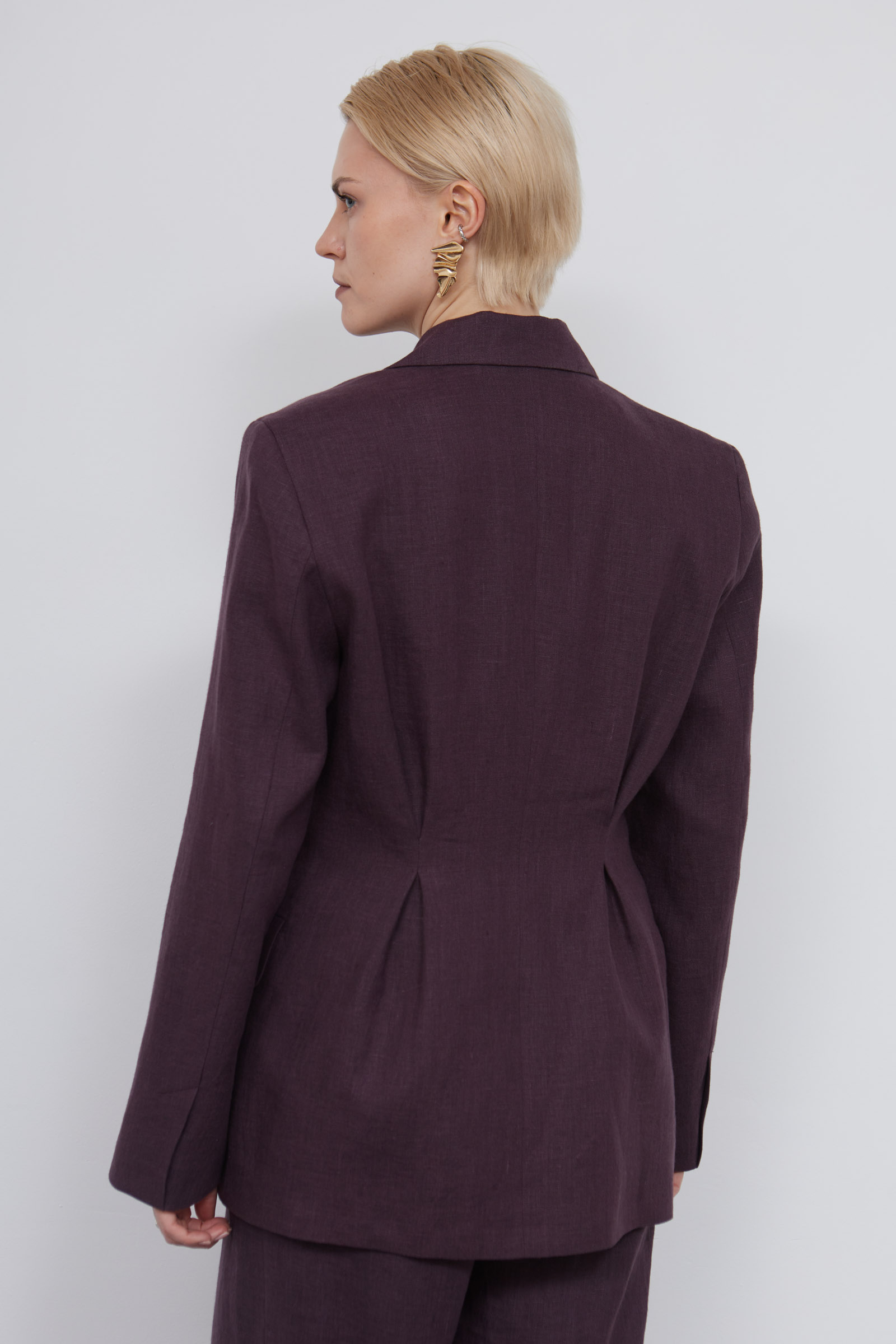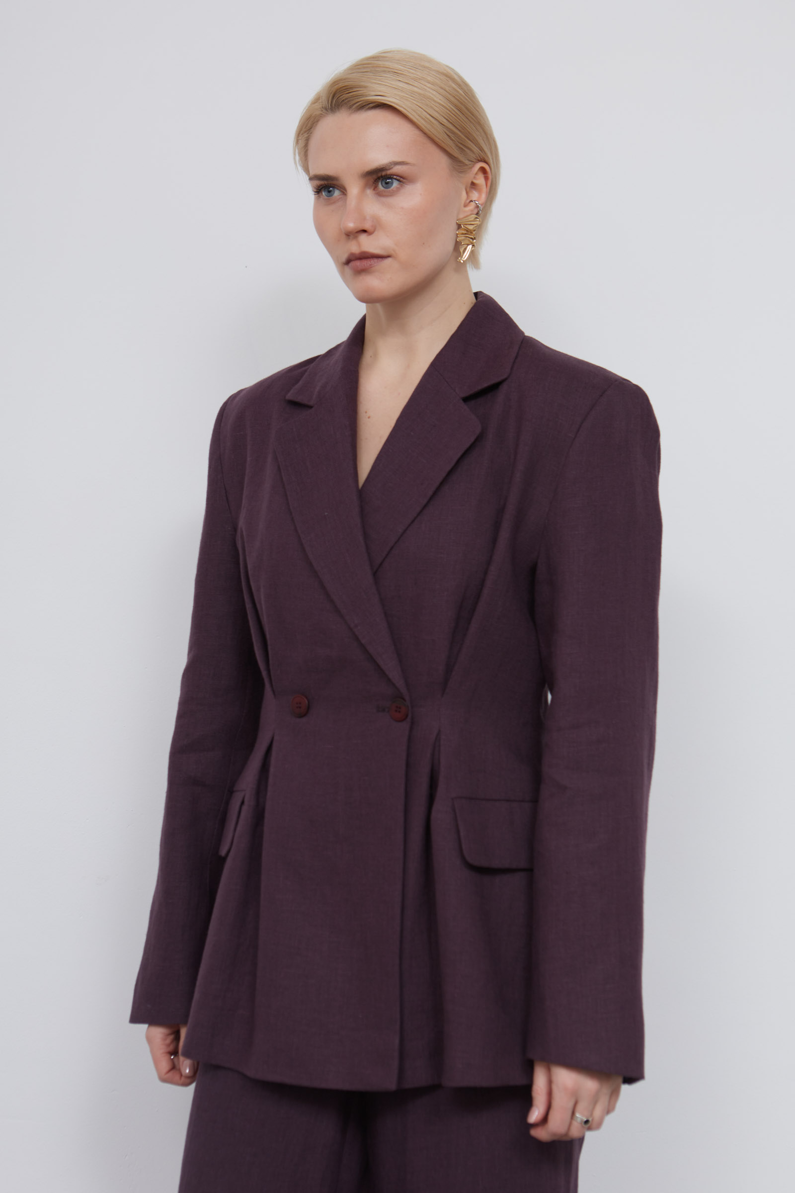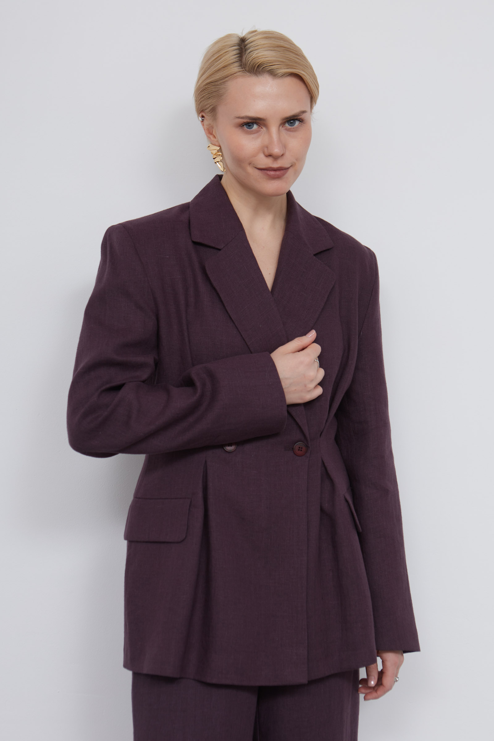 Двубортный льняной жакет с акцентом на талии и подплечниками.