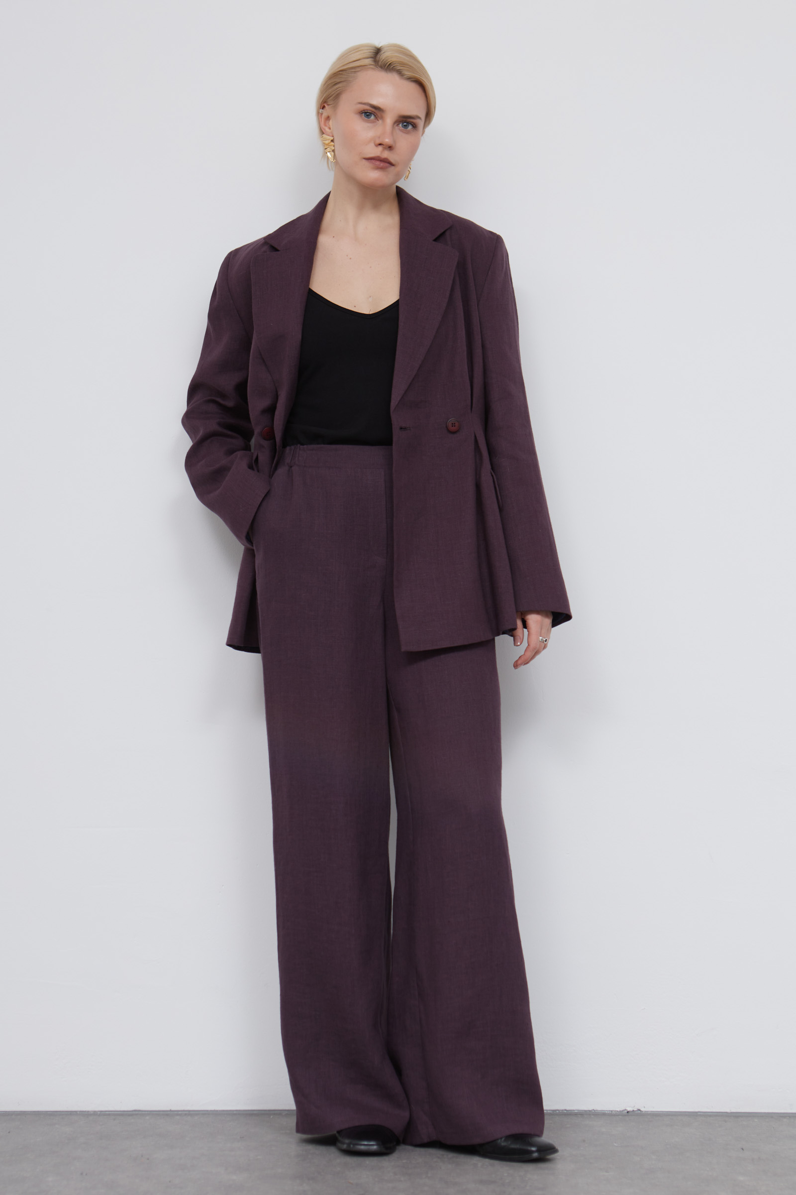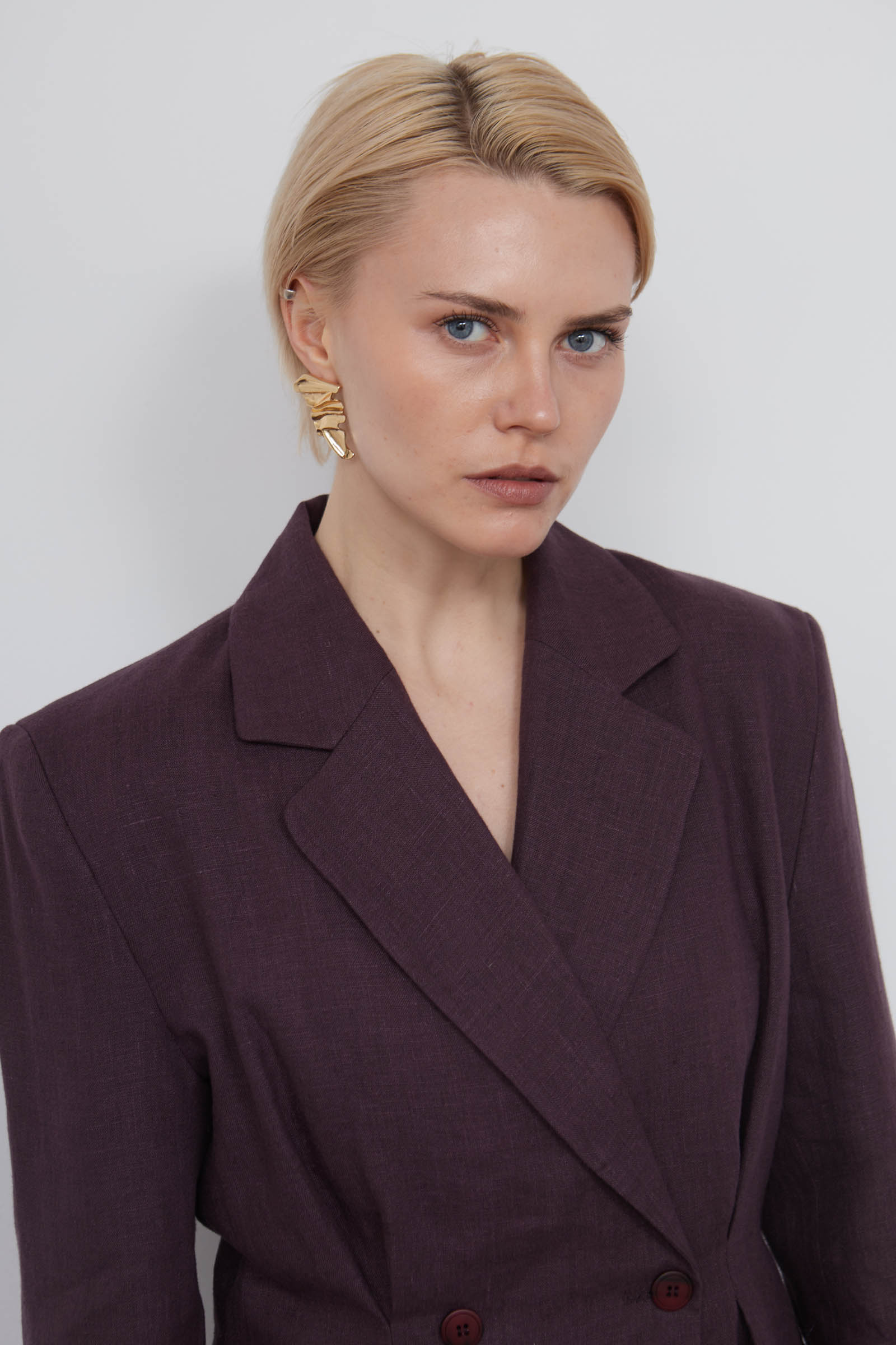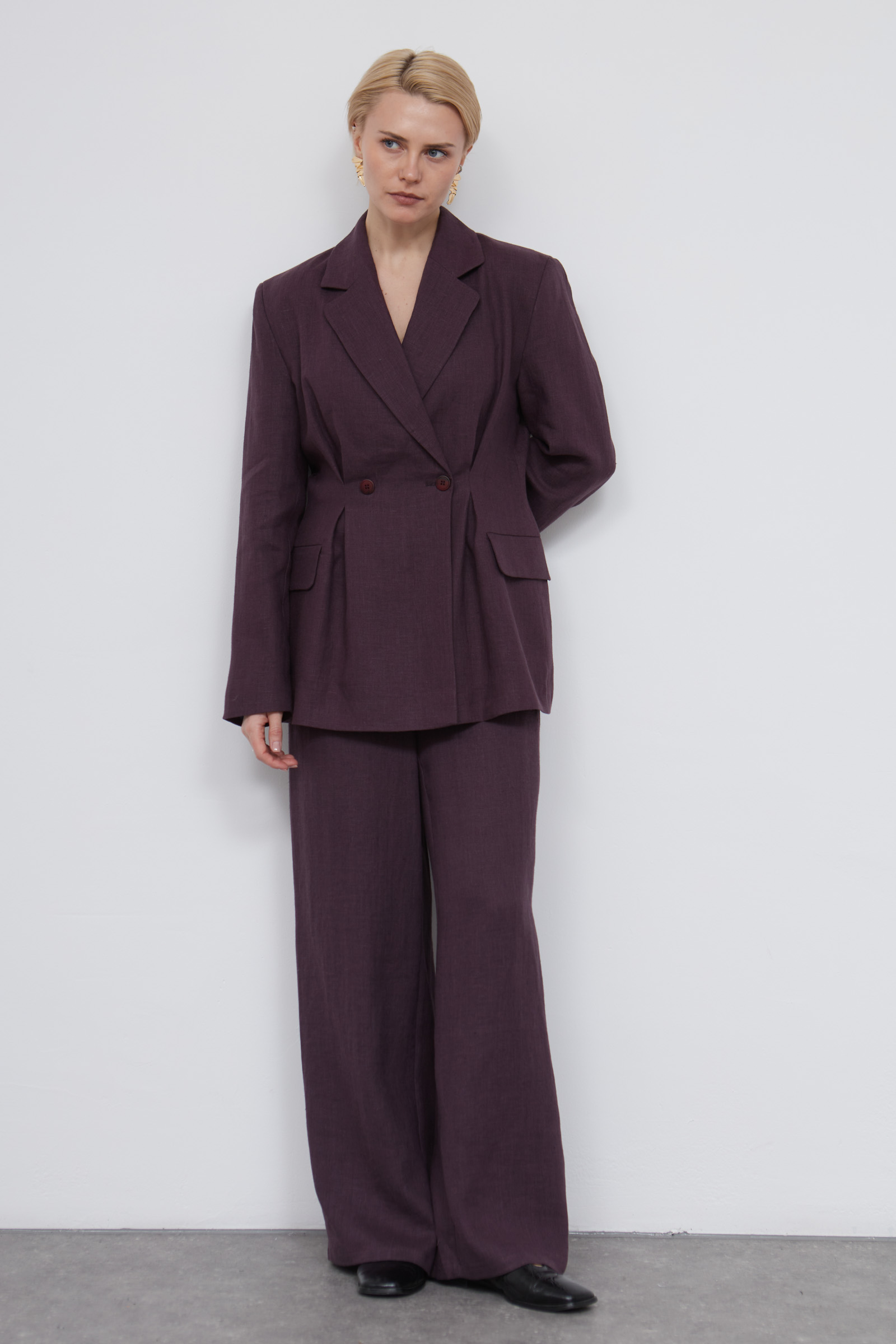 Двубортный льняной жакет с акцентом на талии и подплечниками.