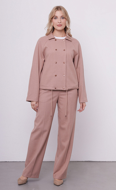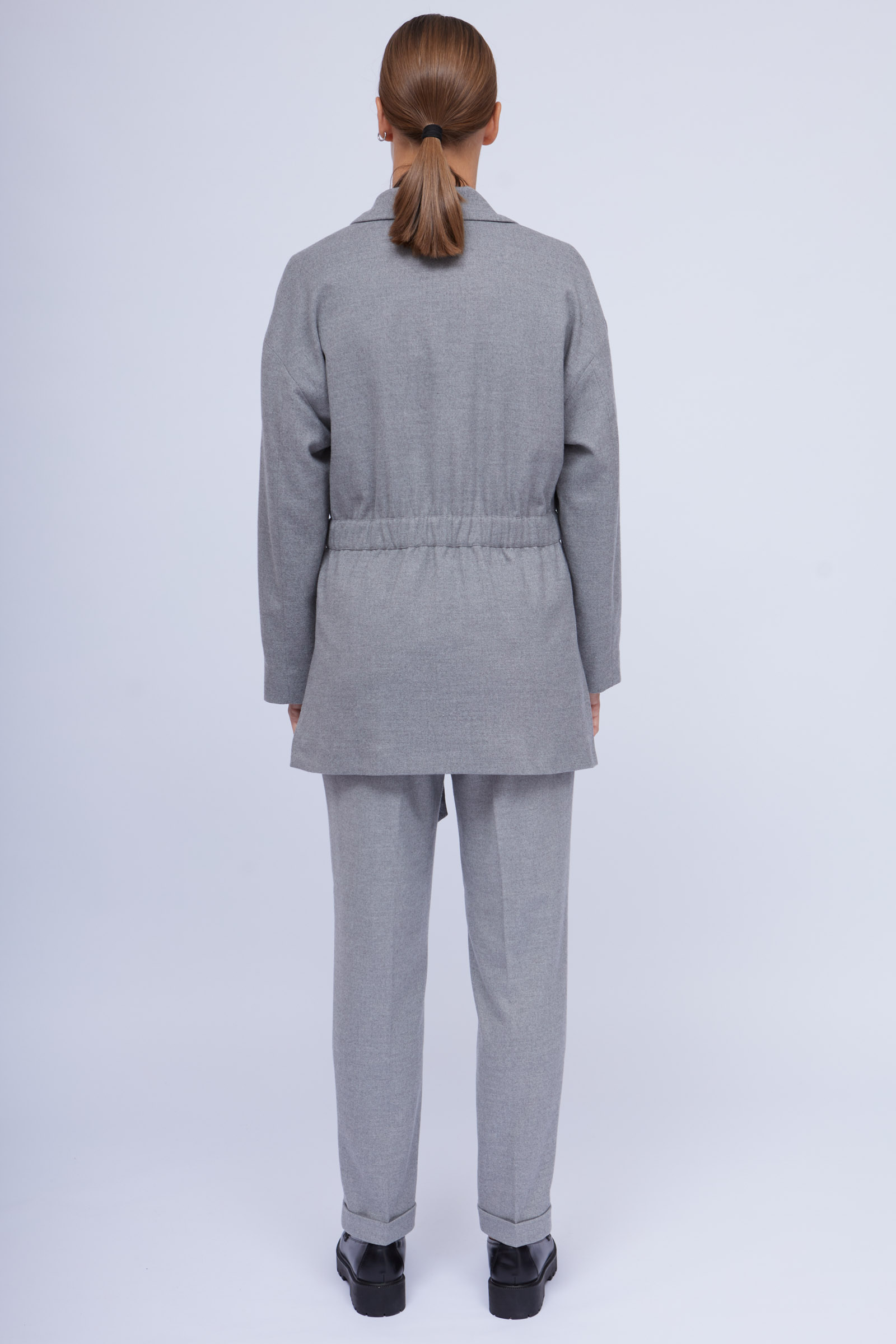 Удлиненный жакет из мягкой фланелевой ткани с поясом и резинкой на спинке.
