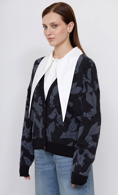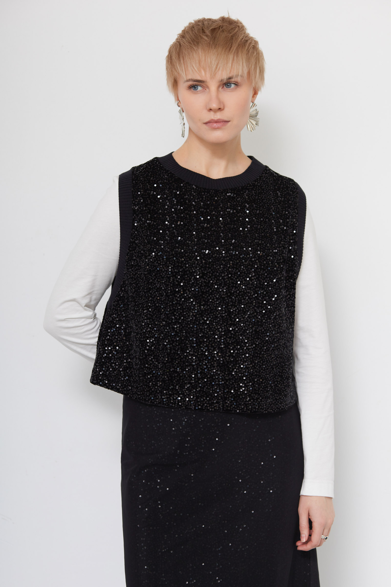 Укороченный жилет oversize из бархата с пайетками и трикотажной отделкой.
