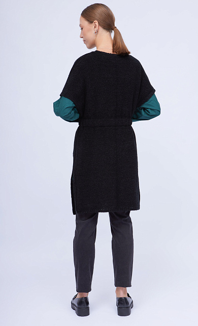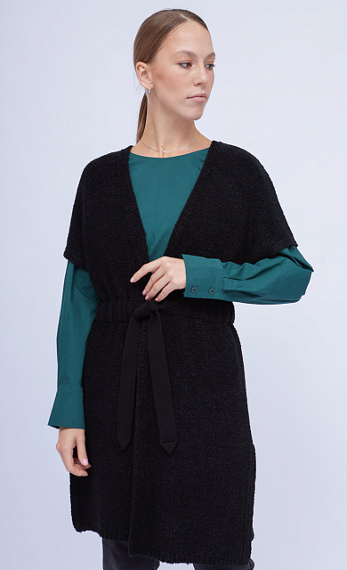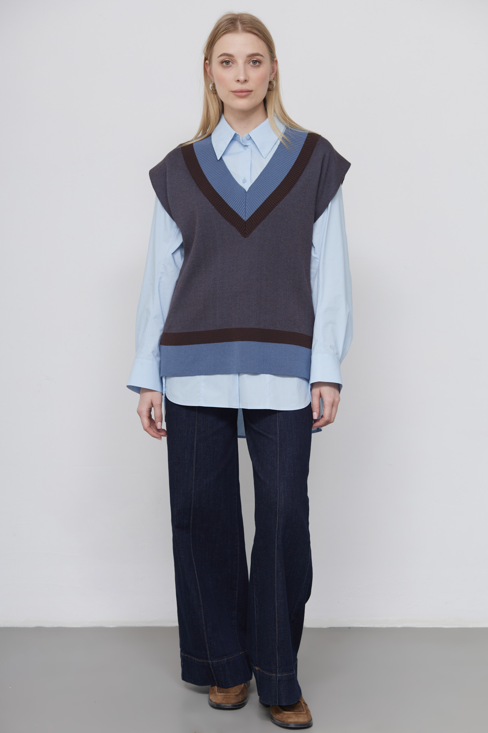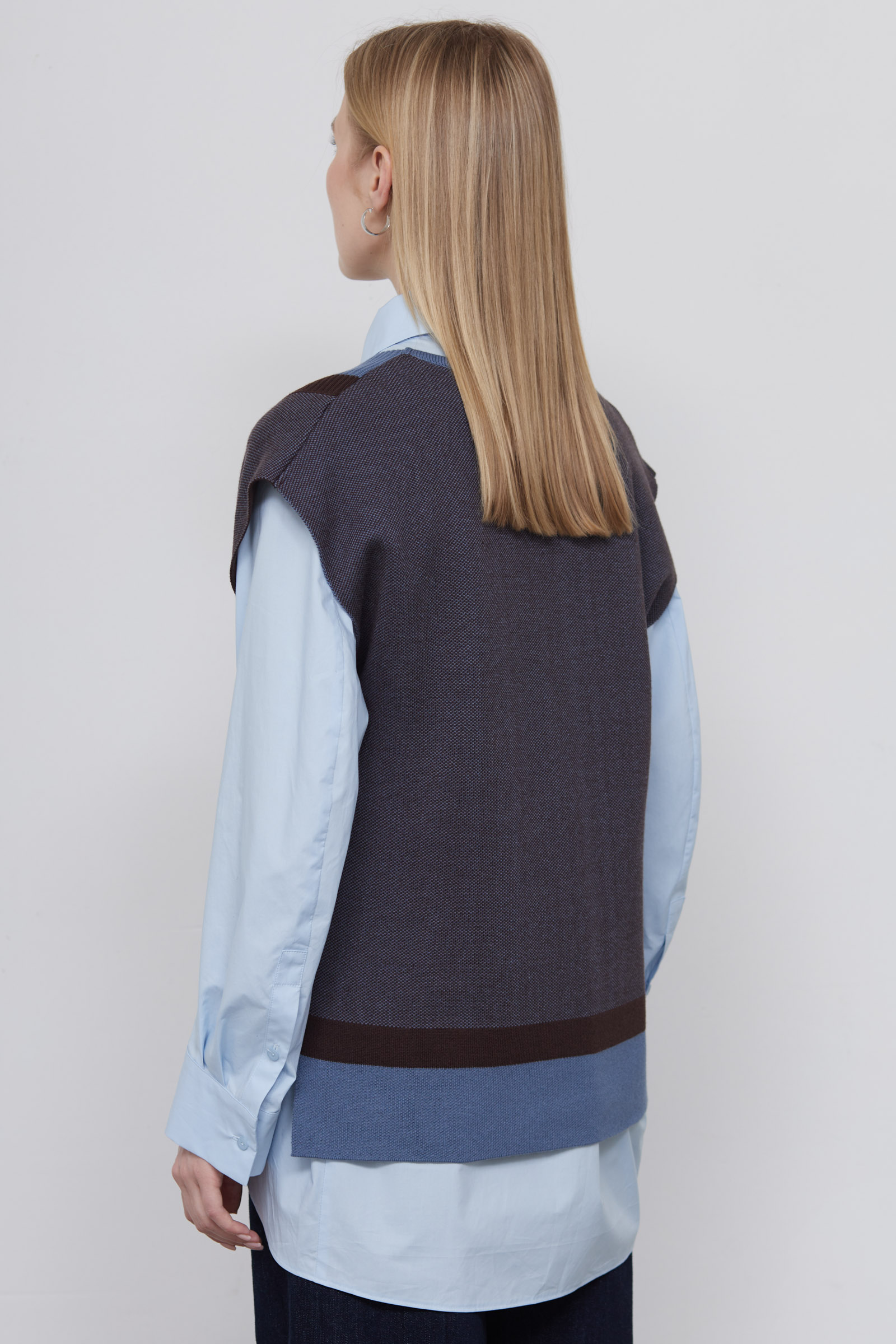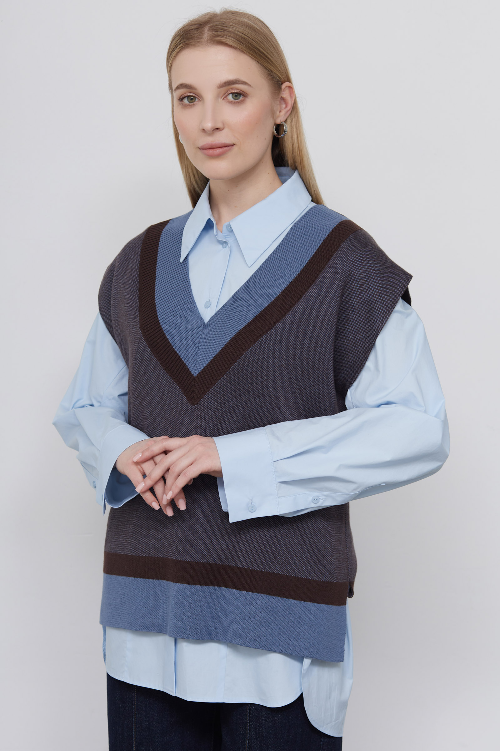 Вязаный жилет oversize с глубоким V-вырезом и контрастными полосками.