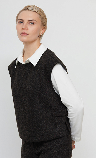 Длинный жилет из мягкого вязаного трикотажа с шерстью и асимметричным вырезом сбоку.