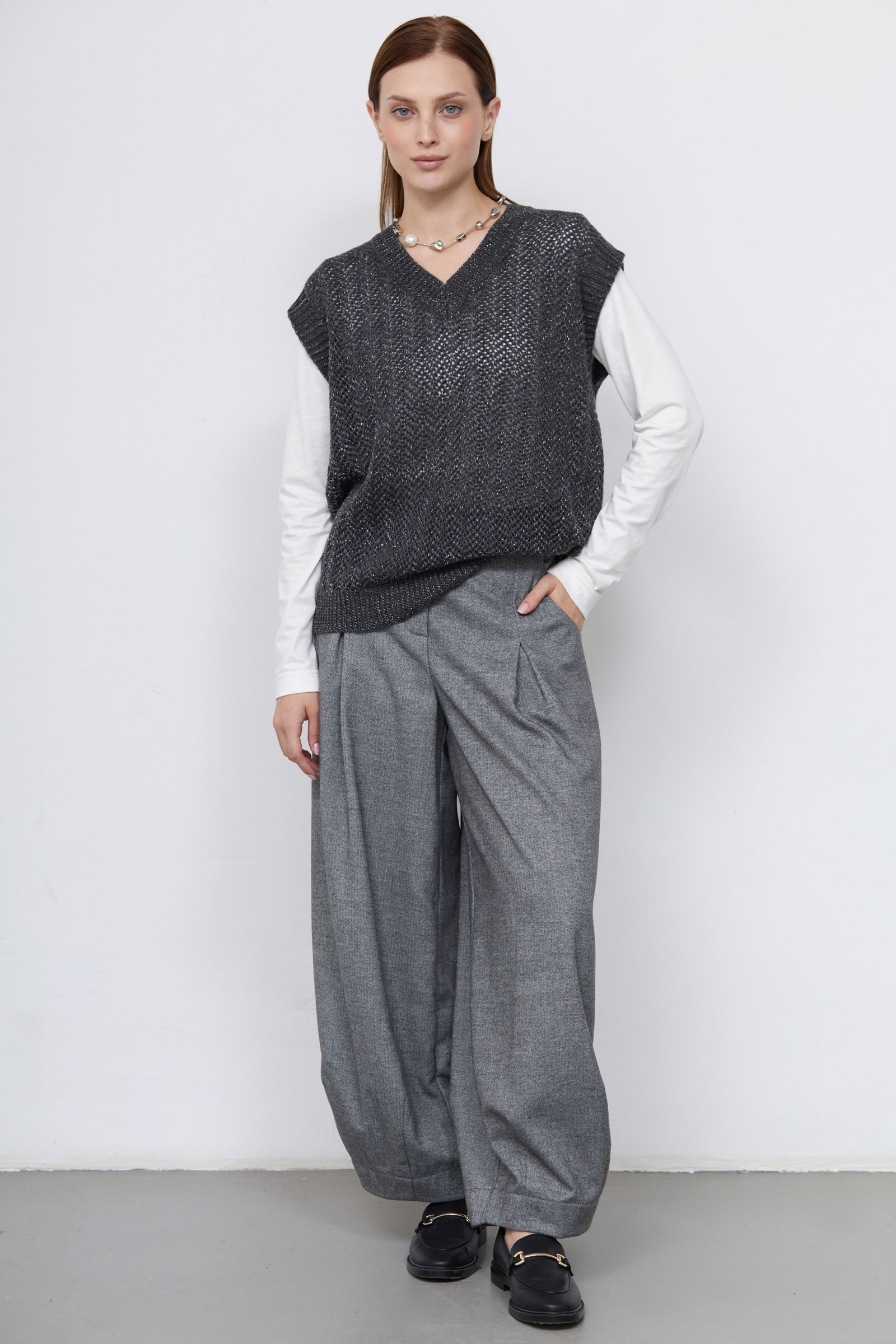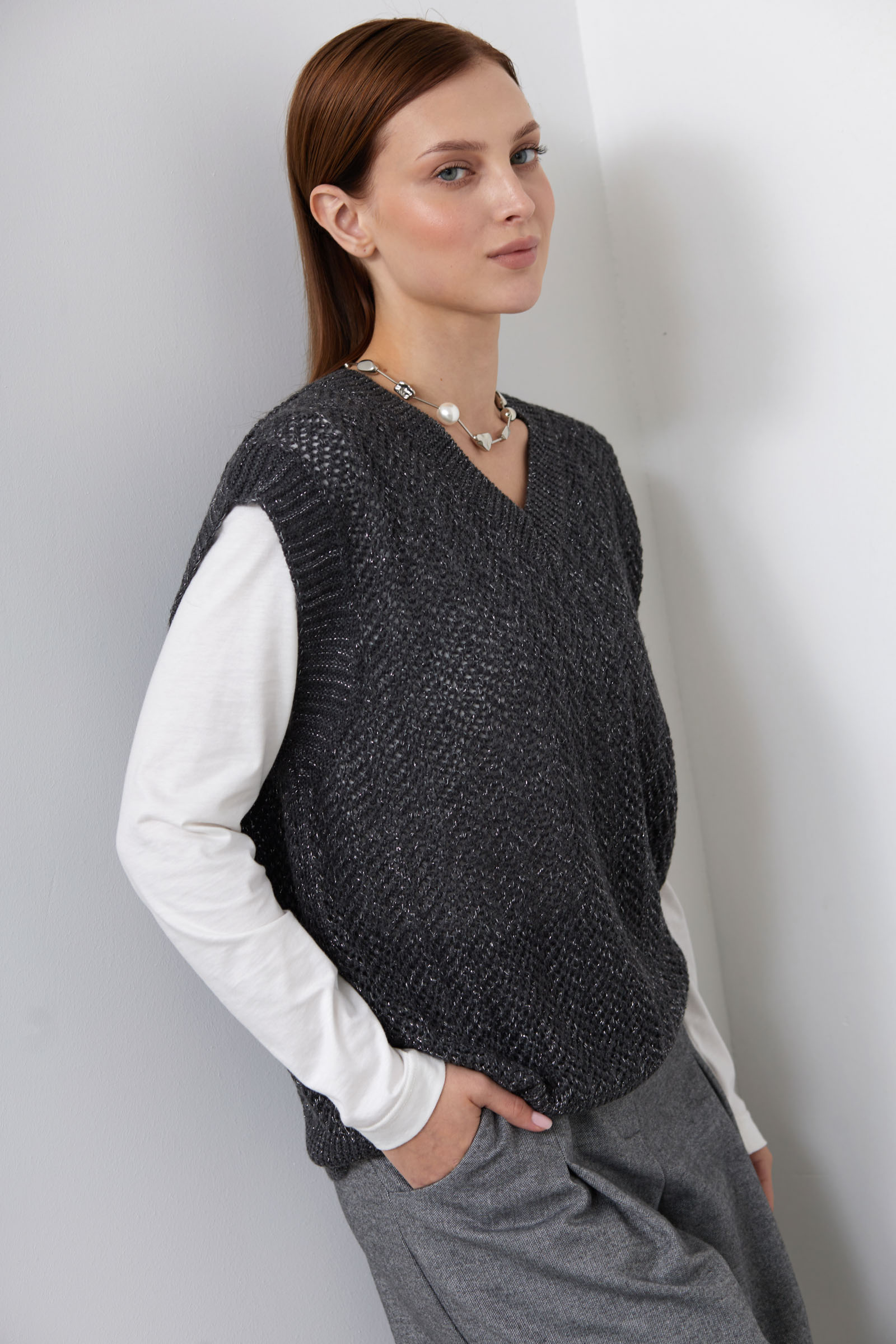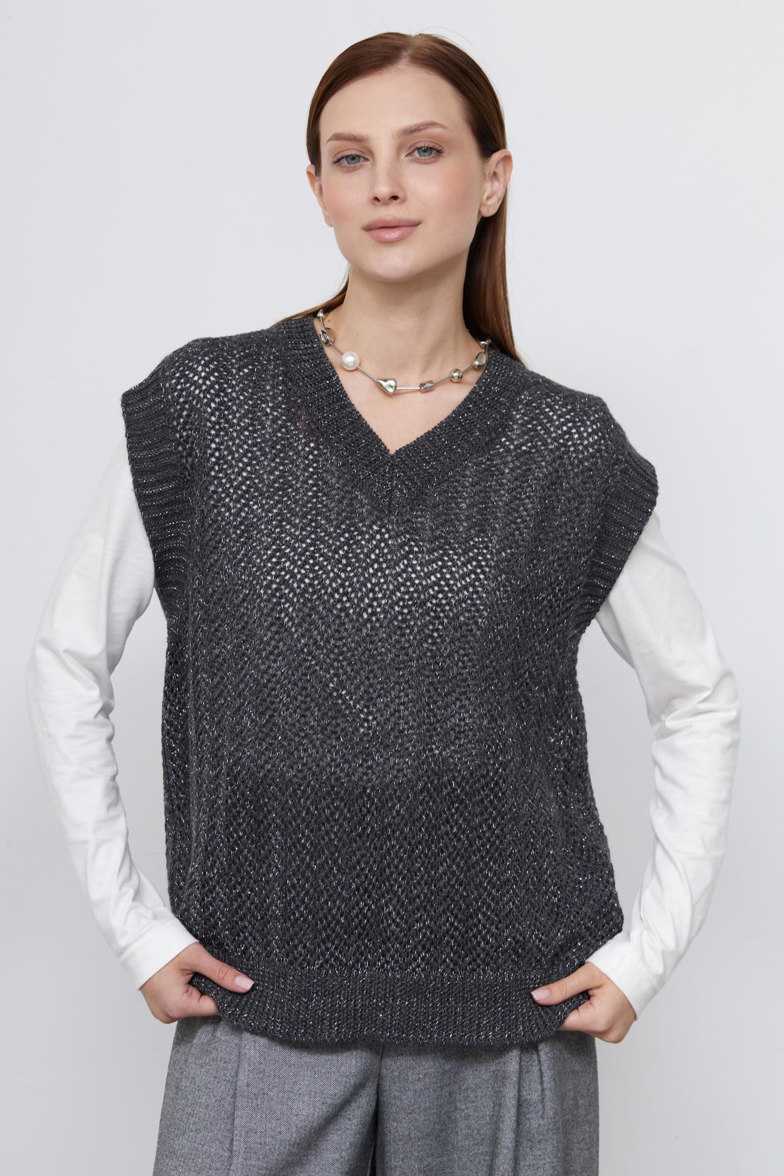 Жилет oversize ажурной вязки с люрексом.