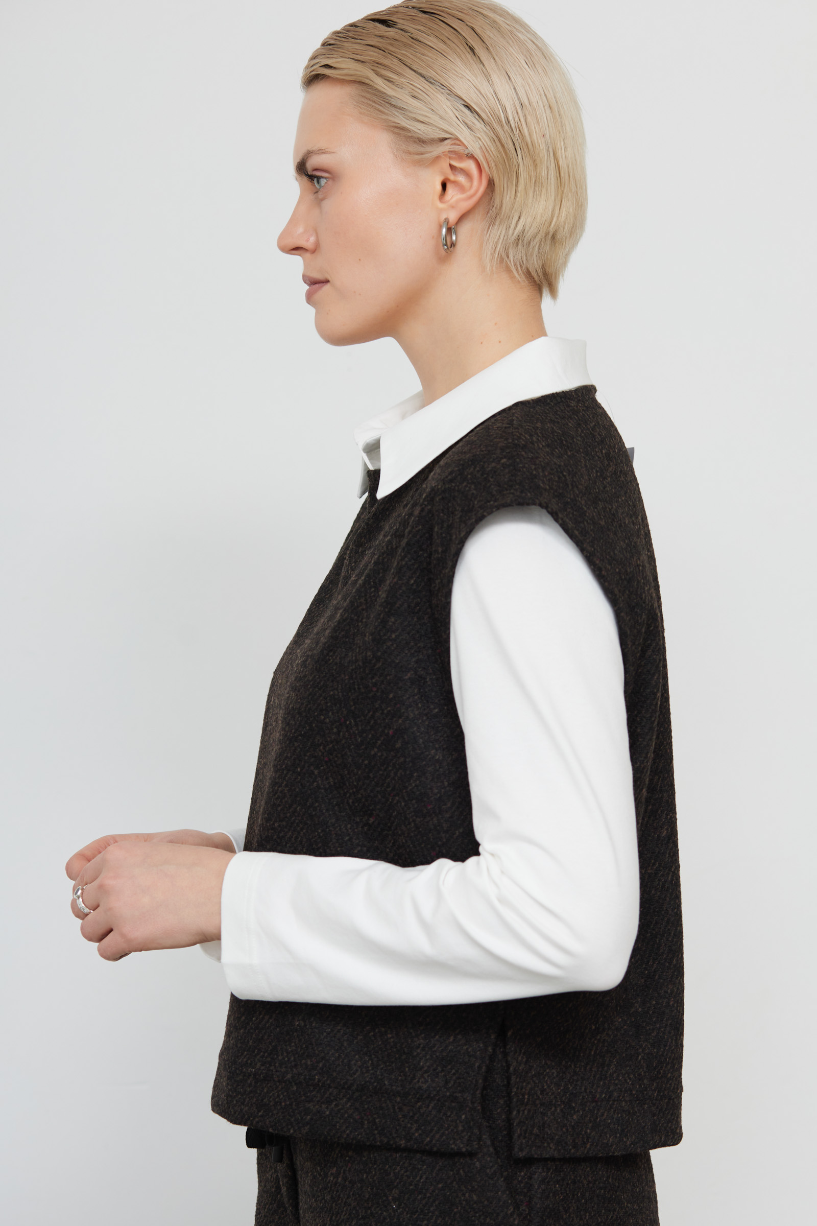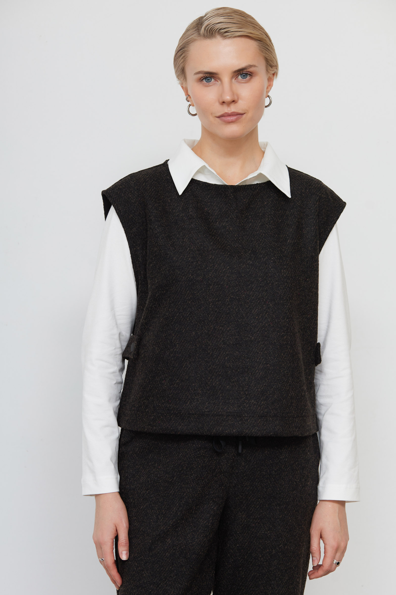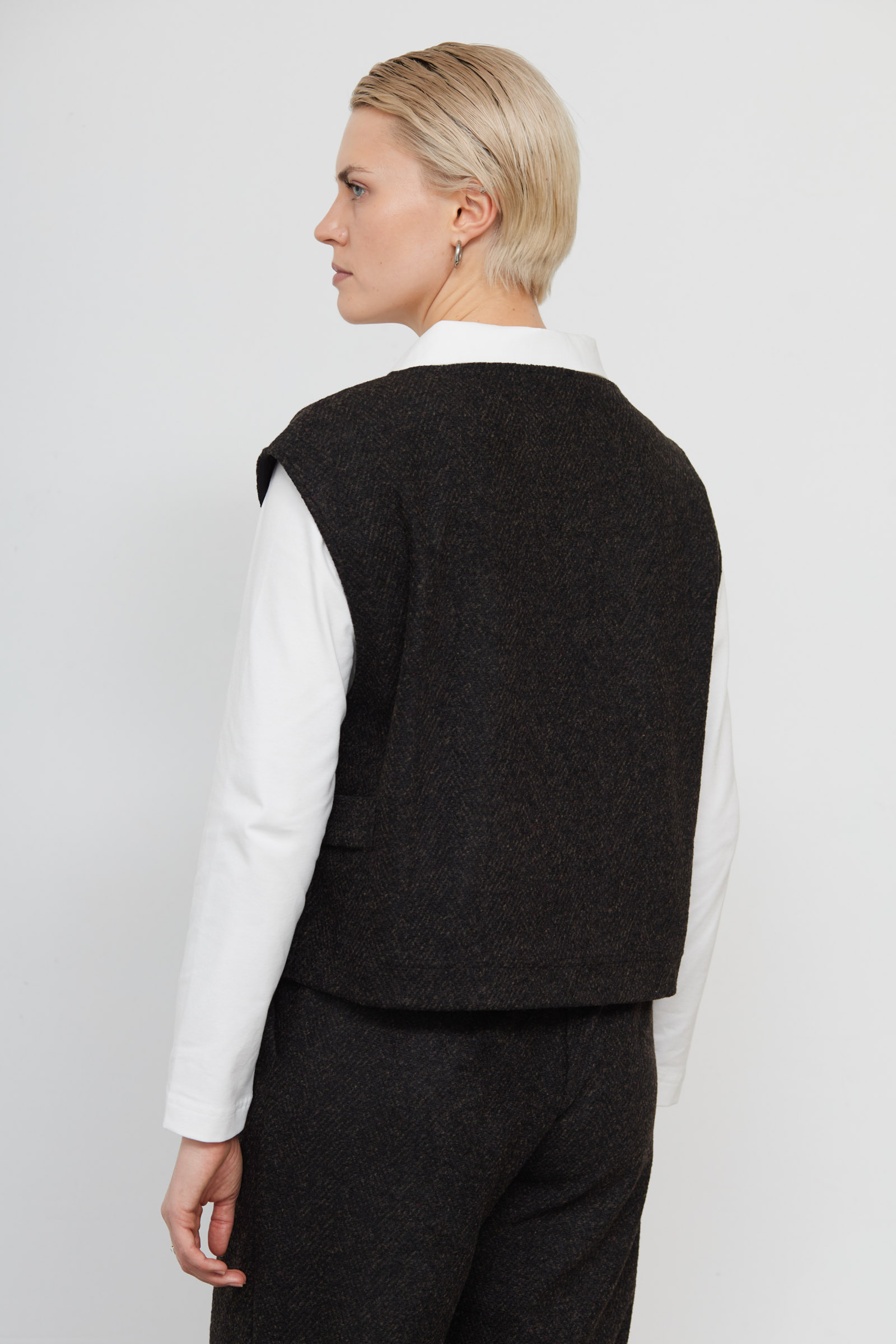 Жилет укороченный из костюмной ткани в елочку.